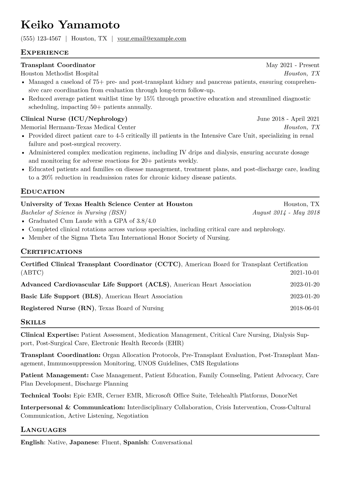 This powerful resume template was built using JobSprout's intuitive builder. You can easily adapt and remix this example to create your own compelling Transplant Coordinator resume, ensuring your unique experience shines.