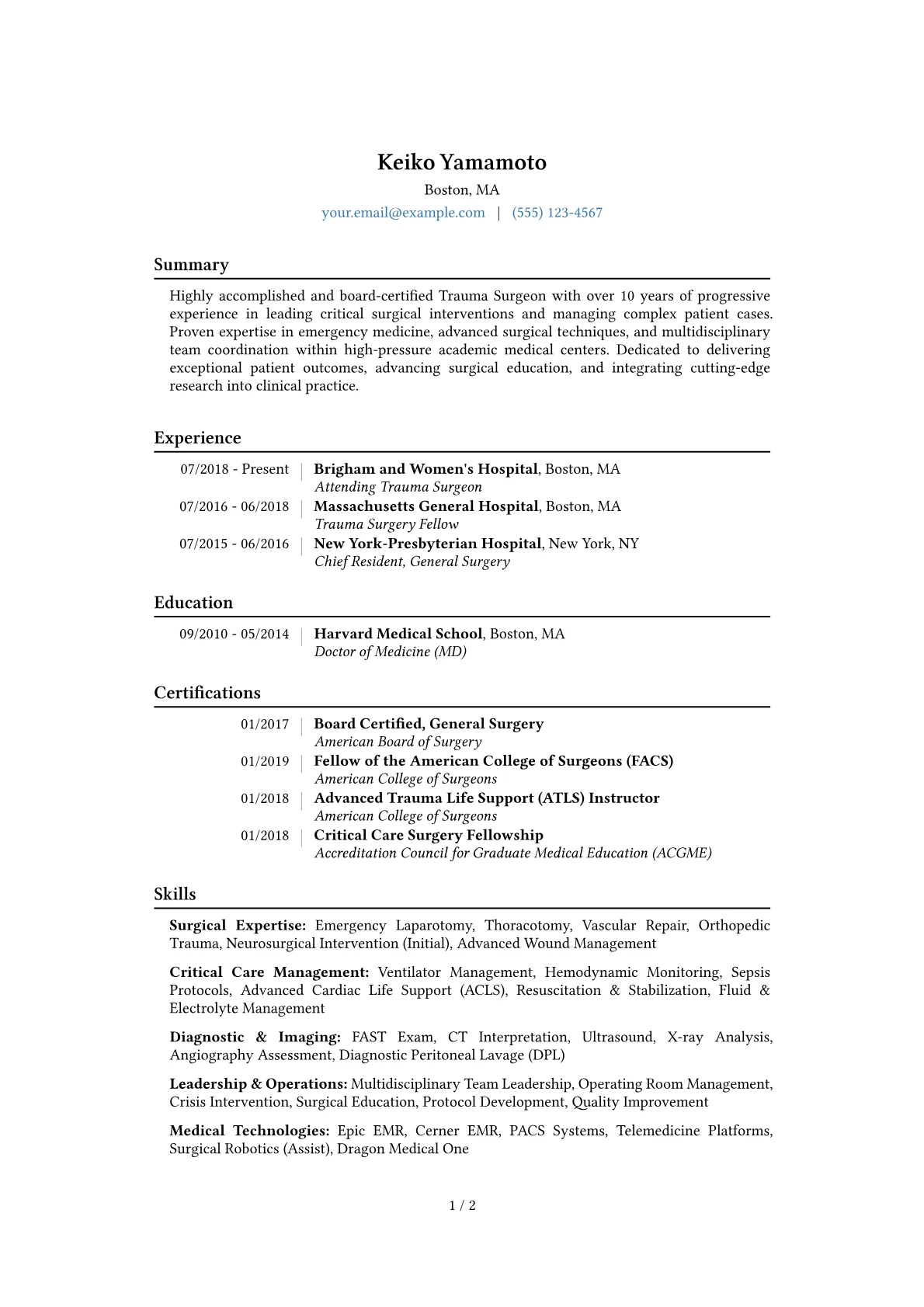 This example CV excels by quantifiably presenting the surgeon's impact. Achievements are precisely detailed, such as "orchestrated emergency surgical interventions for 150+ severe trauma cases annually, improving patient survival rates by 7%." Skills are thoughtfully grouped into categories like "Emergency Surgical Procedures," "Critical Care Management," and "Trauma Team Leadership," providing a clear overview of capabilities. Crucially, specific certifications, including FACS and Surgical Critical Care Board Certification, are prominently displayed, alongside proficiency in relevant EMR systems and advanced diagnostic tools.
