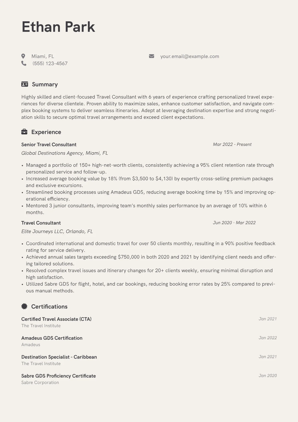 A strong Travel Consultant resume, particularly for mid-level professionals, must demonstrate concrete achievements in client satisfaction and operational efficiency. Hiring managers prioritize candidates who can quantify client retention rates, illustrate their ability to design complex, bespoke itineraries for diverse client needs, and effectively navigate unforeseen challenges such as rebooking during travel disruptions. Specific achievements might include increasing average booking value, reducing client complaint rates, or successfully managing multi-segment international trips. Key terminology like GDS proficiency (e.g., Amadeus, Sabre), CRM system experience, and specialized certifications (e.g., IATA, destination specialist programs) are crucial.