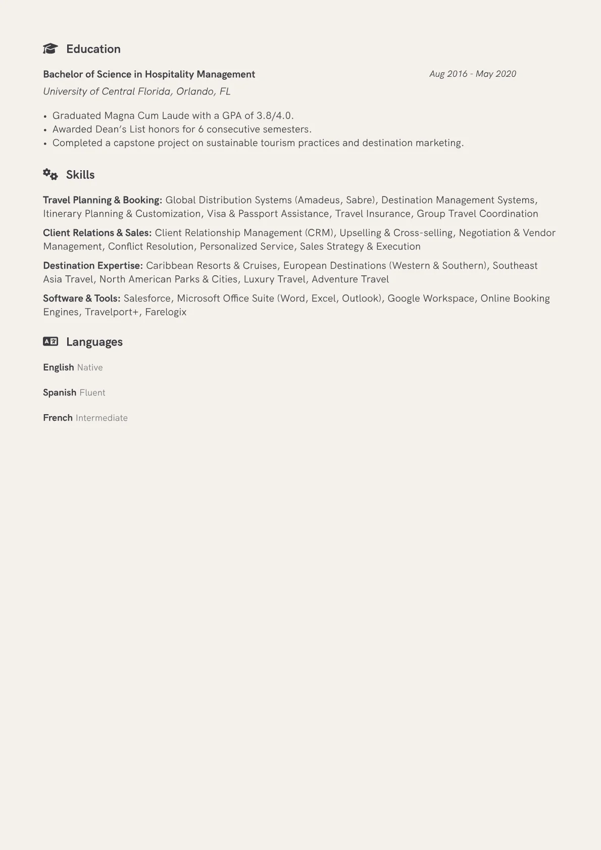 This example resume effectively highlights these critical elements. It thoughtfully groups technical competencies, separating GDS and CRM tools from soft skills like cross-cultural communication and crisis management. Achievements are consistently quantified, demonstrating tangible results such as a "15% increase in repeat client bookings" or "managed budgets for trips exceeding $50,000," which provides clear evidence of impact. Certifications like "IATA certified" are prominently featured, assuring employers of industry standard knowledge and compliance. The resume’s structure makes it easy for recruiters to quickly identify a candidate’s expertise in managing client expectations and delivering successful travel experiences.
