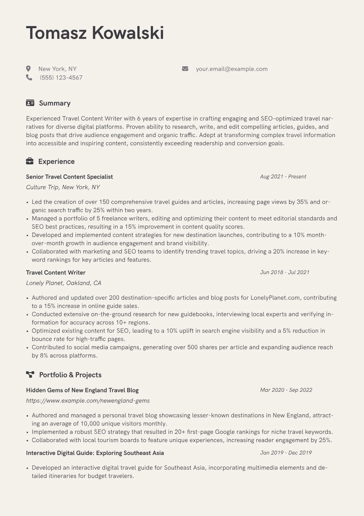 This template was built with JobSprout and can be remixed to create your own tailored Travel Content Writer resume. Utilize its clear structure to present your unique blend of creative and analytical skills.