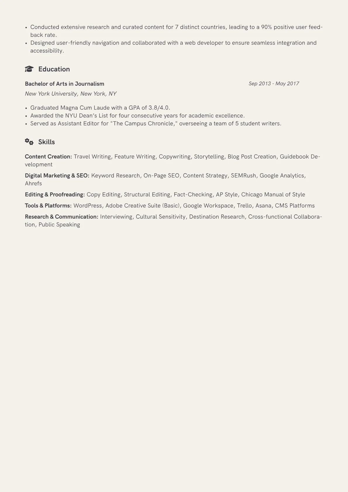 This example CV excels by structuring content strategically, reflecting the industry's digital demands. Achievements are quantified effectively, for instance, detailing specific percentage increases in reader engagement or site traffic for travel features. Skills are intelligently grouped, separating "Content Strategy & SEO" from "Writing & Editing" and "Digital Tools & Analytics," providing immediate clarity on technical proficiencies. The resume prominently highlights certifications like Google Analytics and relevant platforms such as WordPress and Figma, emphasizing a modern content professional's toolkit. It effectively showcases a blend of creative writing talent and data informed content strategy.