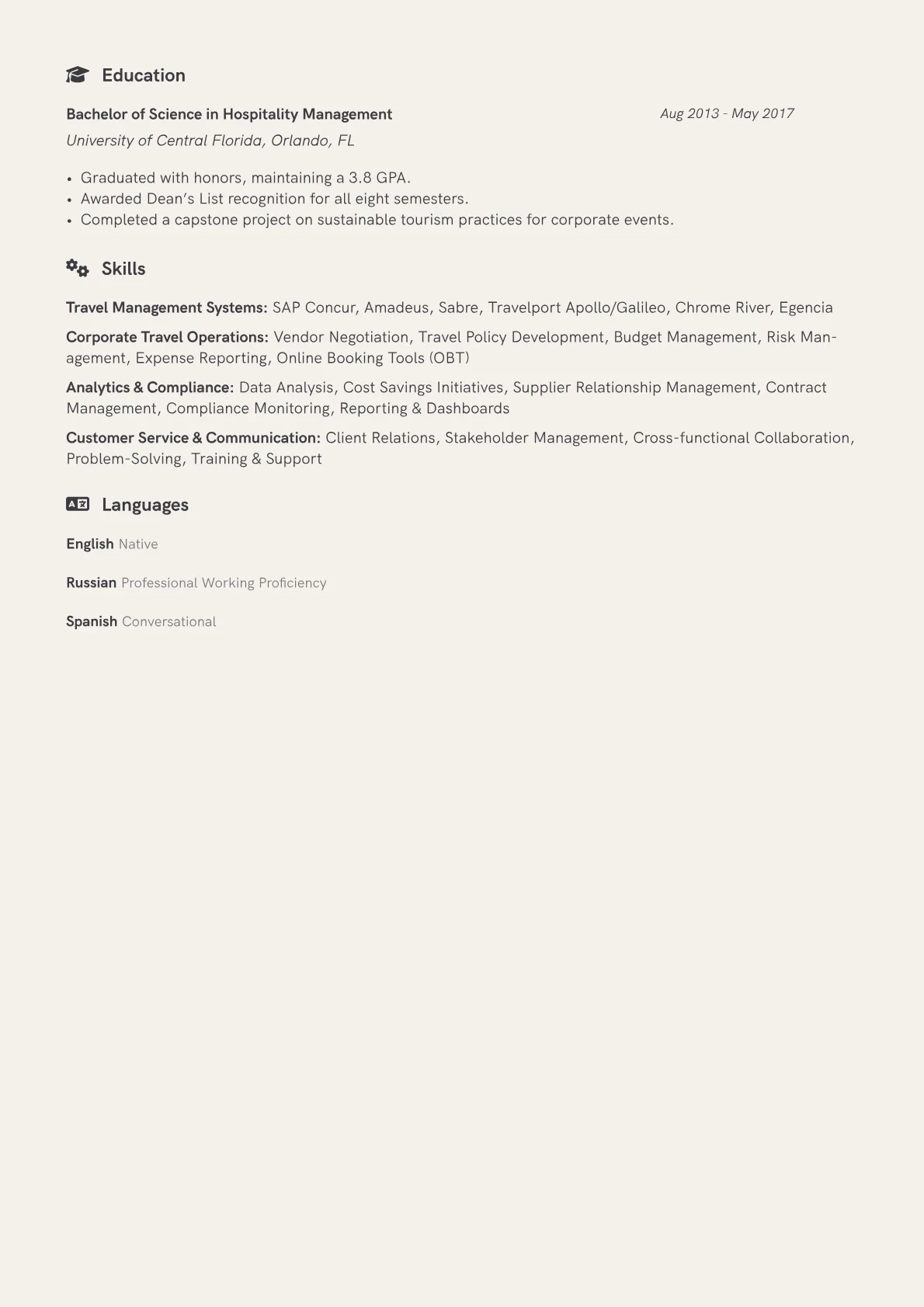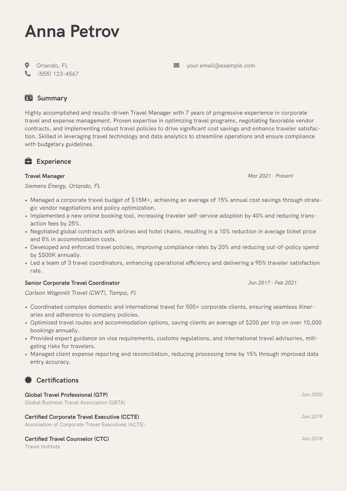 This example CV excels by concretely detailing these crucial aspects. Achievements are quantified effectively, such as "Reduced annual travel expenditure by 18% through strategic vendor renegotiations." Skills are clearly grouped, highlighting both technical proficiencies like GDS systems and strategic capabilities such as "Travel Policy Development" and "Risk Assessment." Critical tools and certifications are prominently featured, including specific booking platforms and industry-recognized credentials, demonstrating a well-rounded and proficient Travel Manager capable of navigating complex corporate travel landscapes.