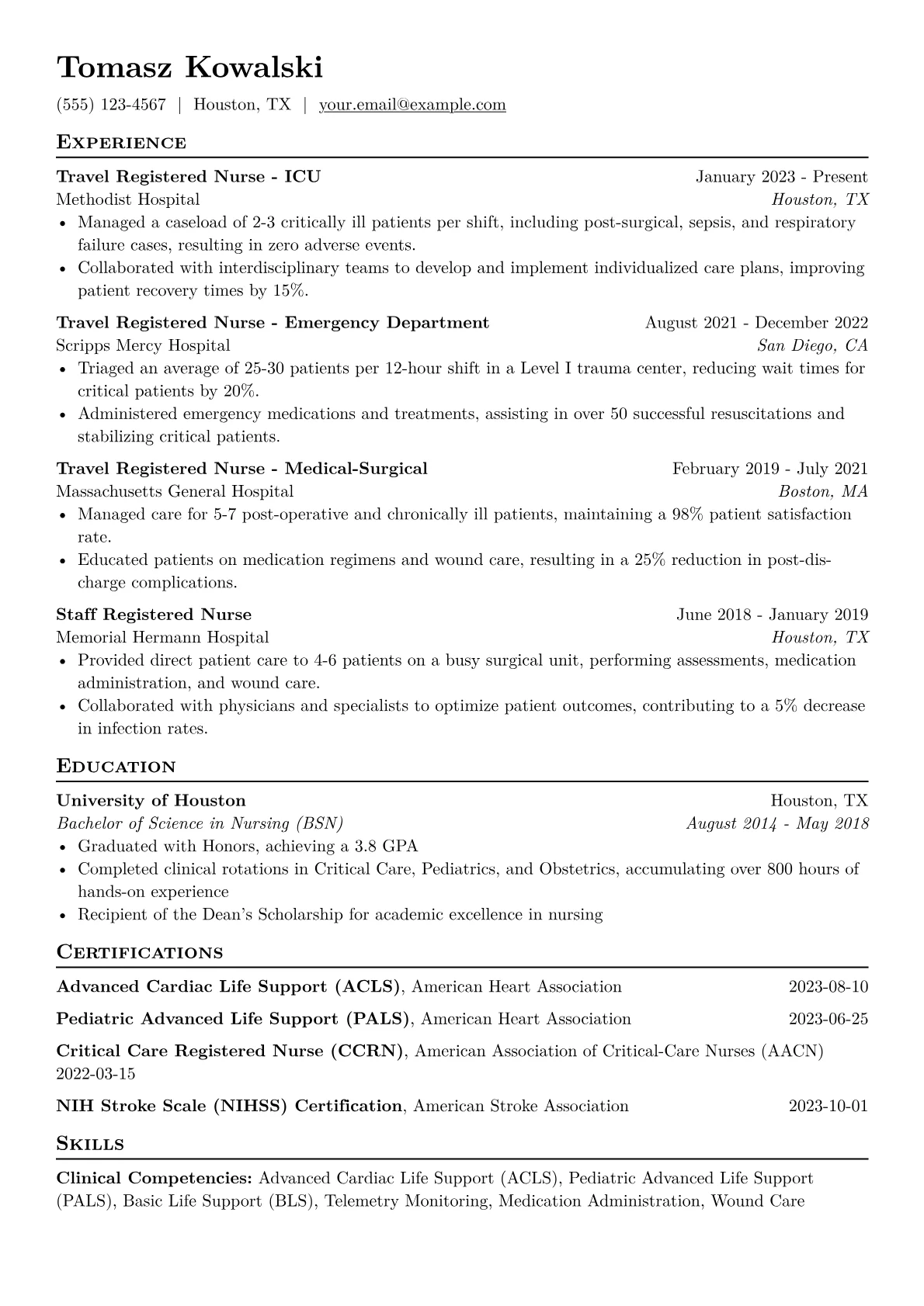 This template was built using JobSprout and provides an excellent foundation. Users can easily remix it to create a personalized Travel Nurse resume tailored to their unique experience.