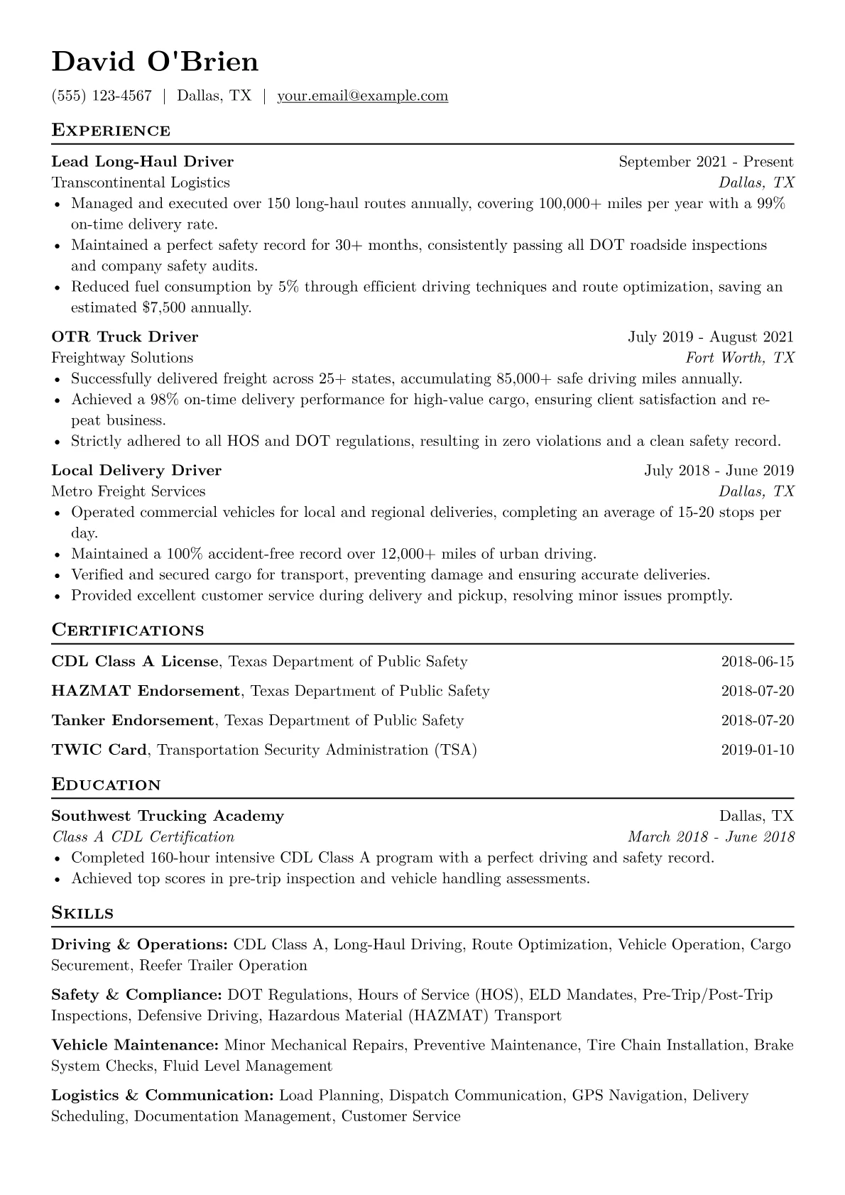 This template, built with JobSprout, provides a robust framework that can be easily remixed to create your own tailored Truck Driver resume. It ensures your specific experience resonates with potential employers.