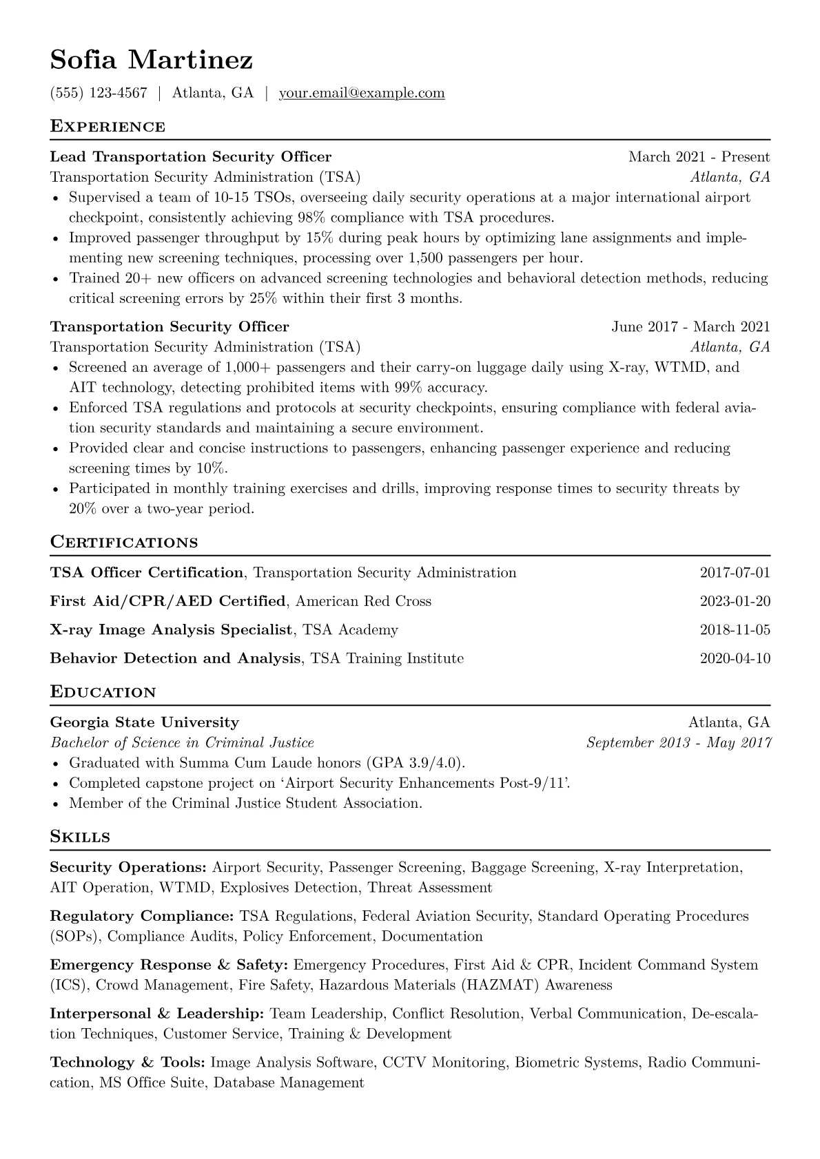 This example effectively showcases these qualities through its structure, notably by using quantified achievements to demonstrate impact, such as passenger screening volumes or successful contraband identifications. The inclusion of specific, relevant certifications, like X-ray operator training, immediately validates specialized skills. Grouping core competencies, such as "Security Operations" and "Compliance Management," provides an accessible overview of a candidate's expertise.