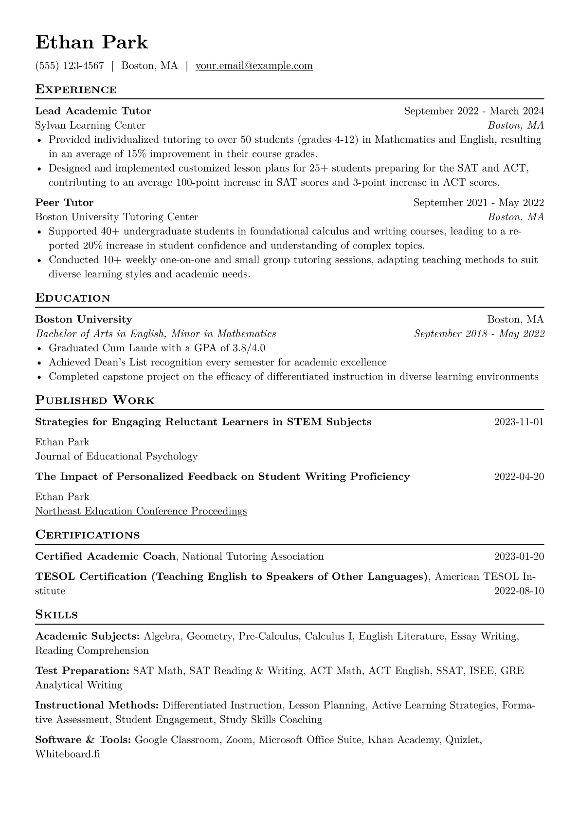 A strong Tutor resume effectively highlights a candidate's subject matter expertise, communication skills, and proven ability to foster student success. Hiring managers in education seek evidence of a tutor's patience, adaptability, and capacity to explain complex concepts clearly. The unique challenge for this role often lies in quantifying impact and showcasing soft skills without extensive formal teaching experience.