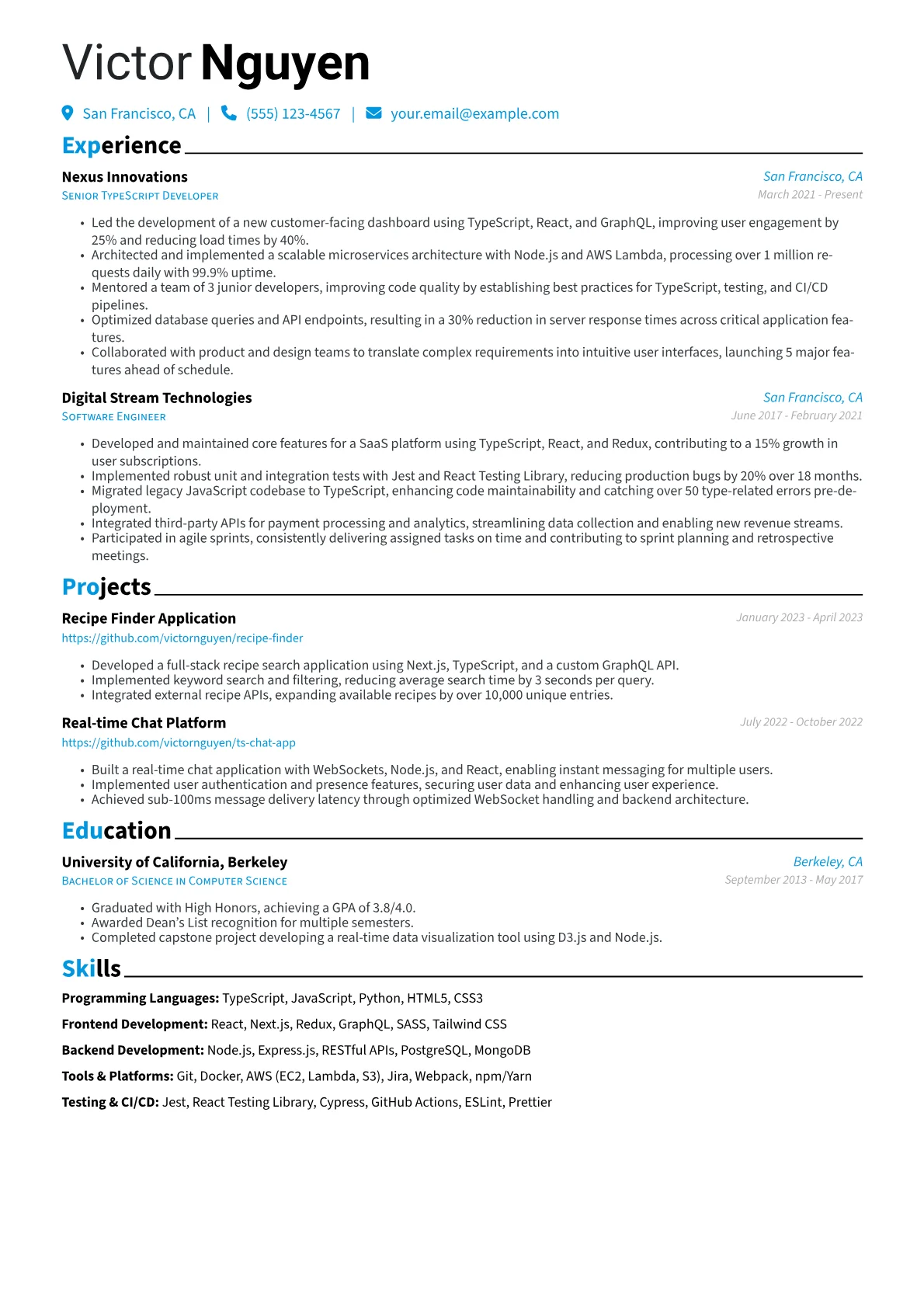This JobSprout example excels by immediately presenting quantified achievements that demonstrate tangible impact on projects and teams. The clear segmentation of technical skills, including specific TypeScript versions and related frameworks, allows recruiters to quickly assess relevant competencies. Highlighting relevant certifications further reinforces a commitment to professional development in the field.