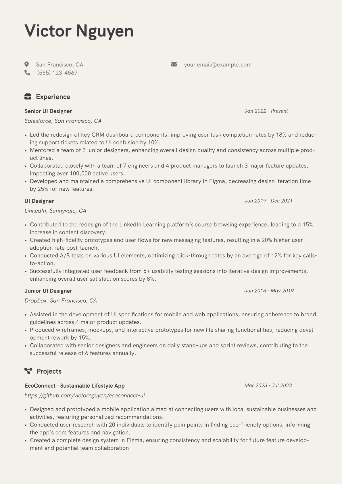 This highly effective UI Designer resume was created using a JobSprout template, offering job seekers a robust framework they can readily adapt and personalize for their own applications.