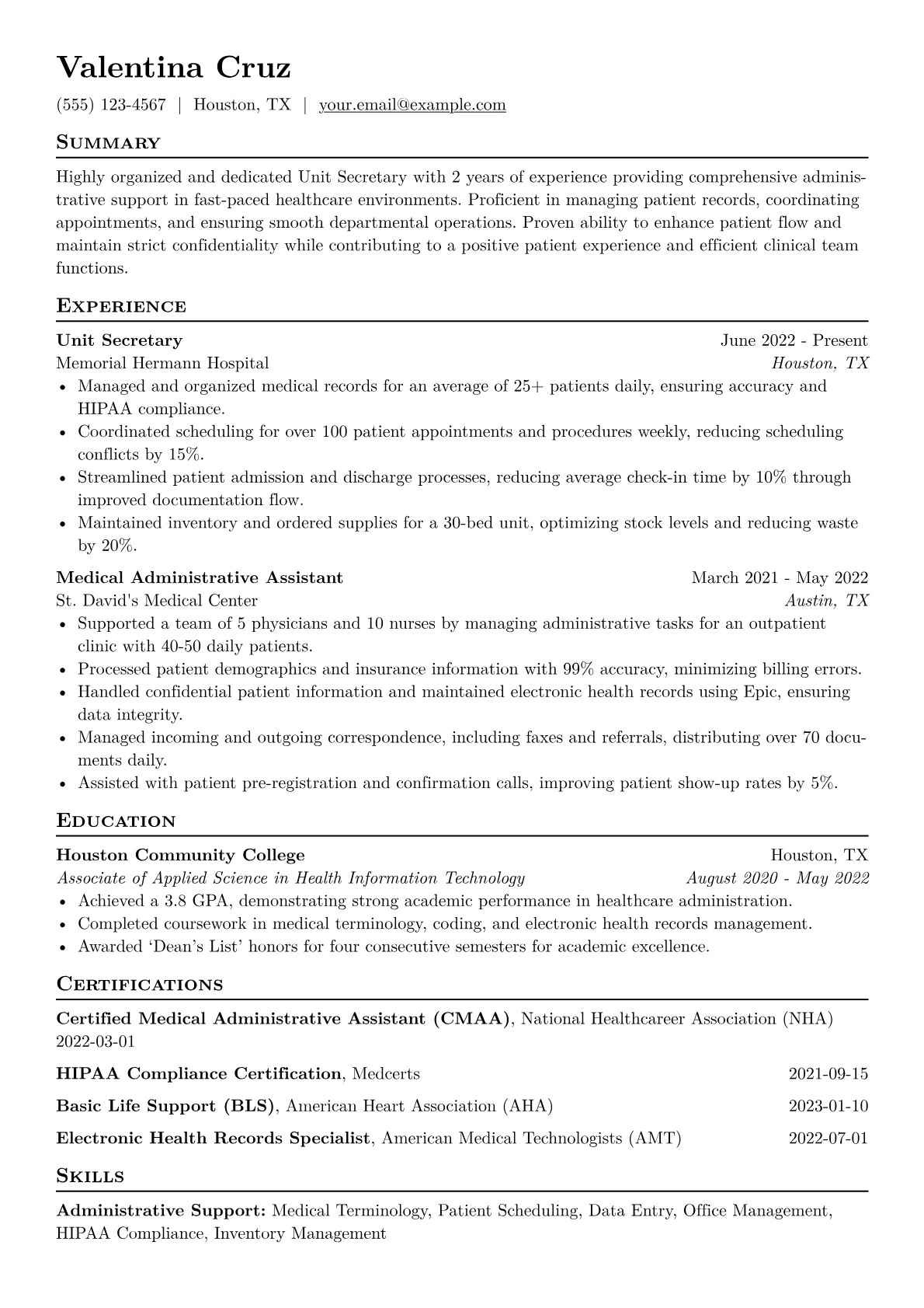 This template was built with JobSprout and can be remixed to create your own tailored Unit Secretary resume. Utilize its framework to highlight your unique skills and secure your next administrative role.