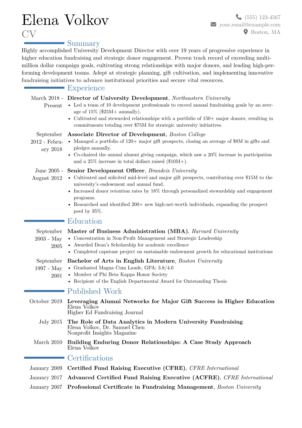 This example CV effectively highlights a director's strategic impact by quantifying all achievements. It details leadership in securing multi-million dollar philanthropic support and exceeding campaign targets, rather than simply listing duties. Skills are logically grouped into categories like "Fundraising Strategy," "Donor Relations," and "Team Leadership," making complex competencies easy to grasp. The inclusion of relevant certifications like CFRE and proficiency with industry-standard CRMs such as Raiser's Edge further strengthens the candidate's executive profile, showcasing both strategic vision and operational command.