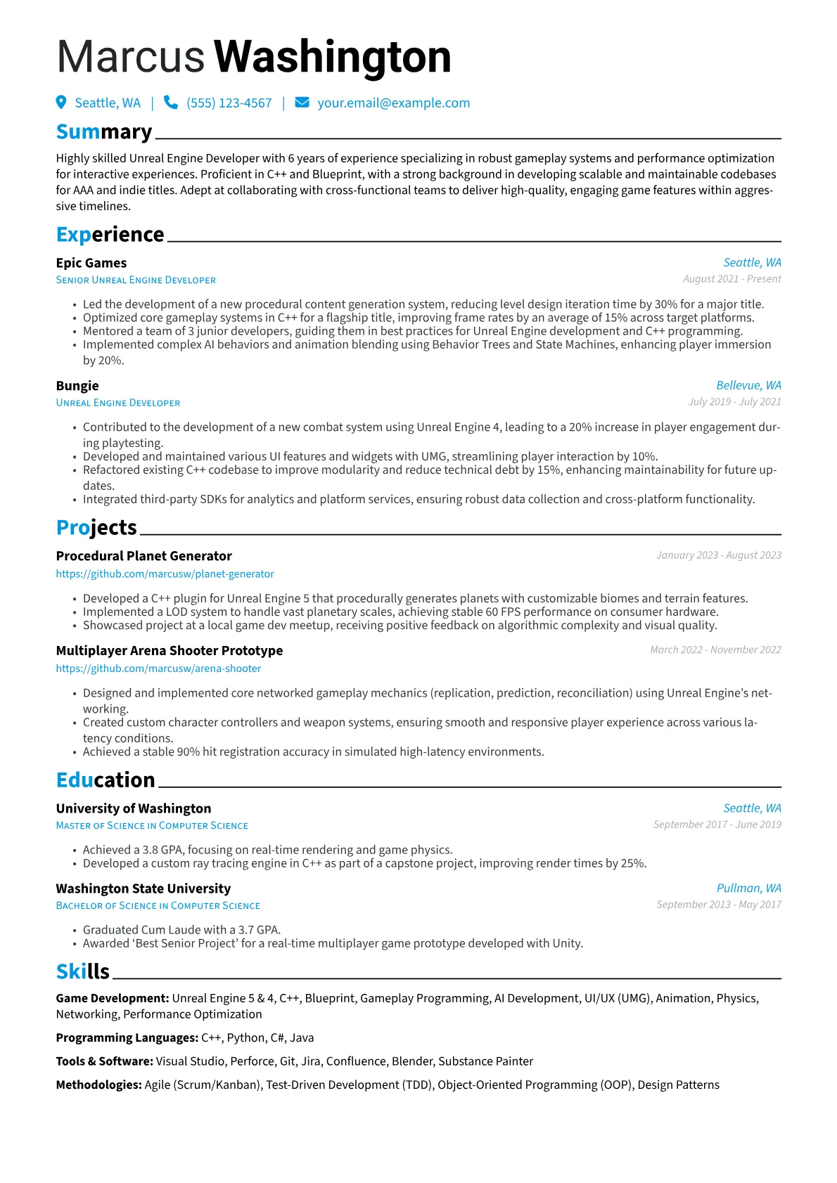 This template was built with JobSprout and can be remixed to create your own tailored Unreal Engine Developer resume.