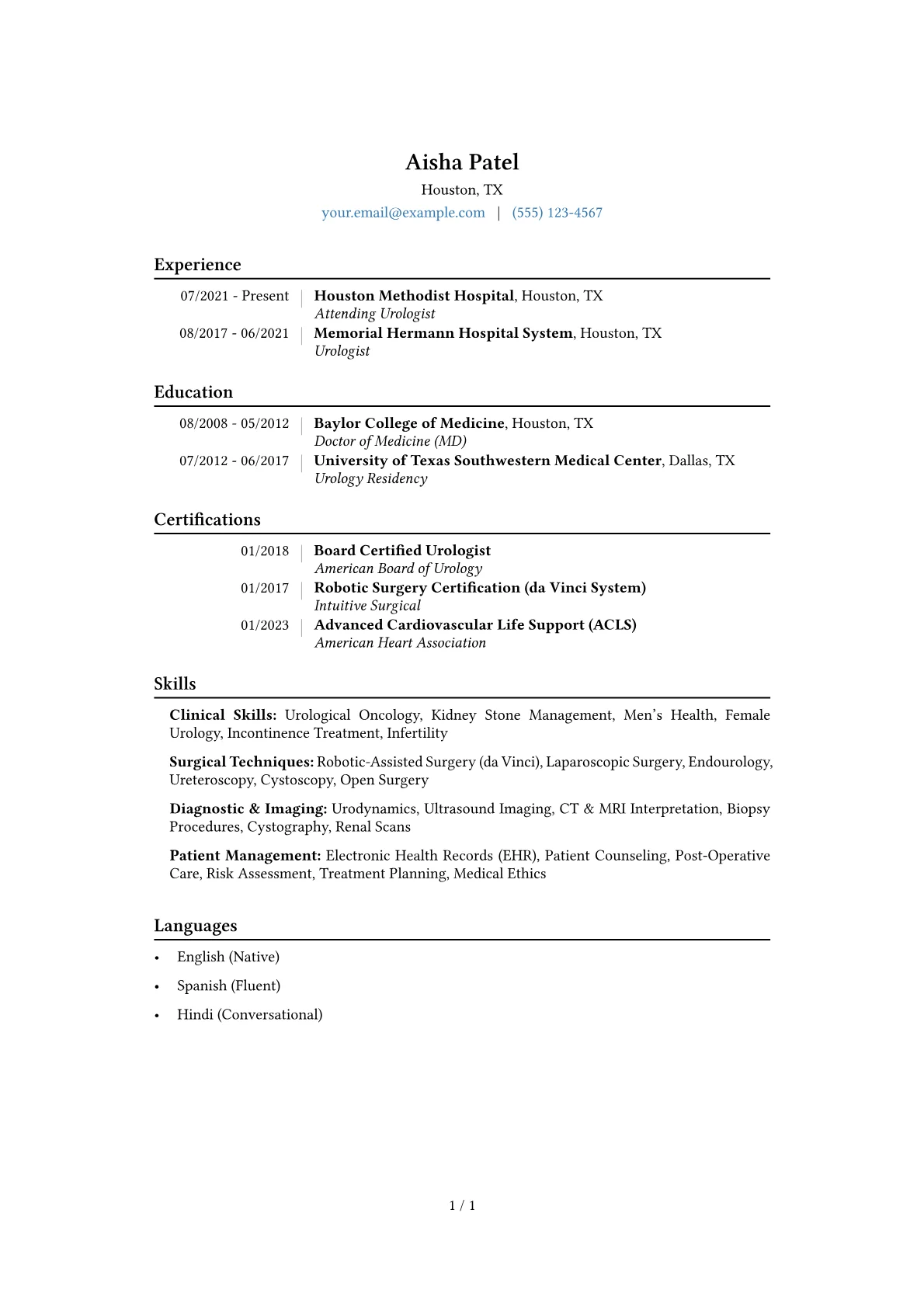 Crafting an impactful Urologist resume requires highlighting specialized clinical expertise, successful patient outcomes, and a strong command of advanced surgical techniques. Hiring managers in healthcare prioritize candidates who demonstrate exceptional diagnostic skills, experience with cutting-edge urological procedures, and a clear dedication to patient care and safety. The unique challenge lies in concisely showcasing a complex skillset and significant experience.