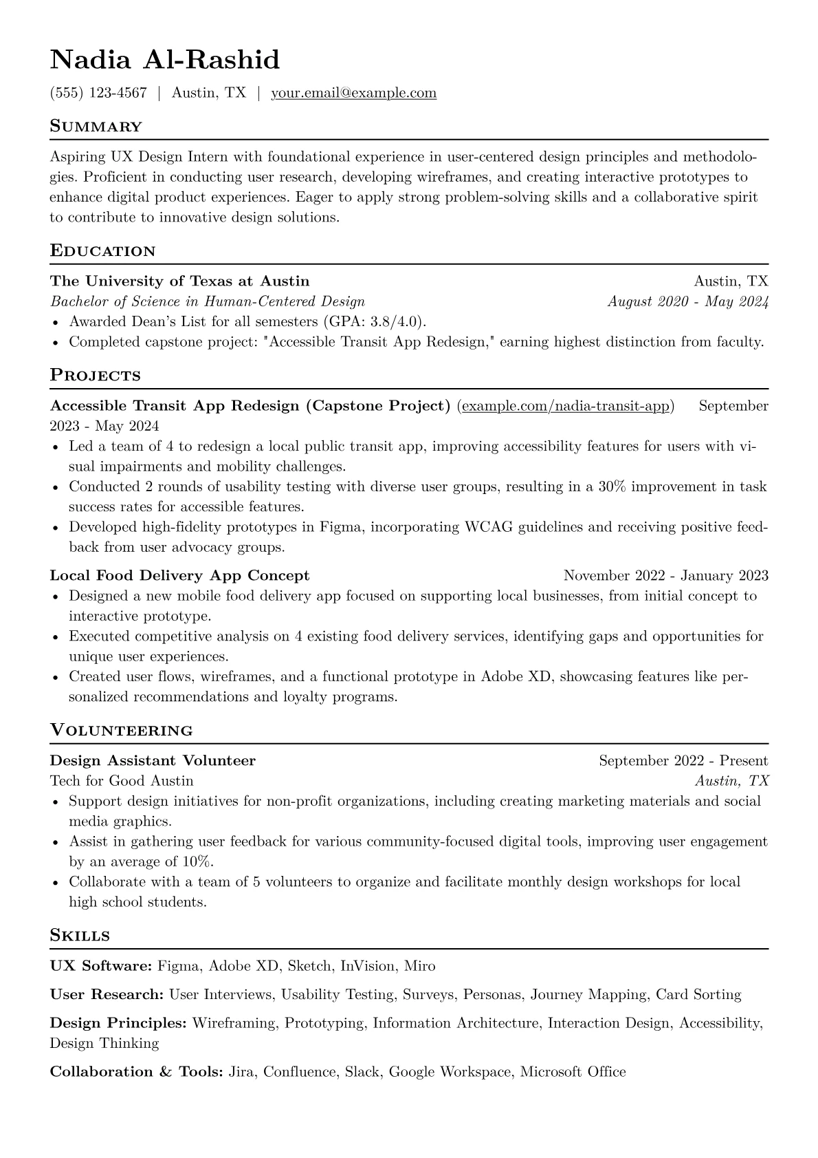 This example CV excels at presenting an intern's nascent experience effectively. Achievements are well-quantified, detailing specific impacts like "identified three key user pain points" or "developed low-fidelity wireframes for a new feature." Skills are thoughtfully grouped into categories such as "Design Software," "Research Methods," and "Core UX Principles," enabling quick evaluation of proficiencies. The resume also prominently features a link to a design portfolio, which is indispensable for a UX role, and clearly lists mastery of industry-standard tools, signaling readiness to contribute to a design team.