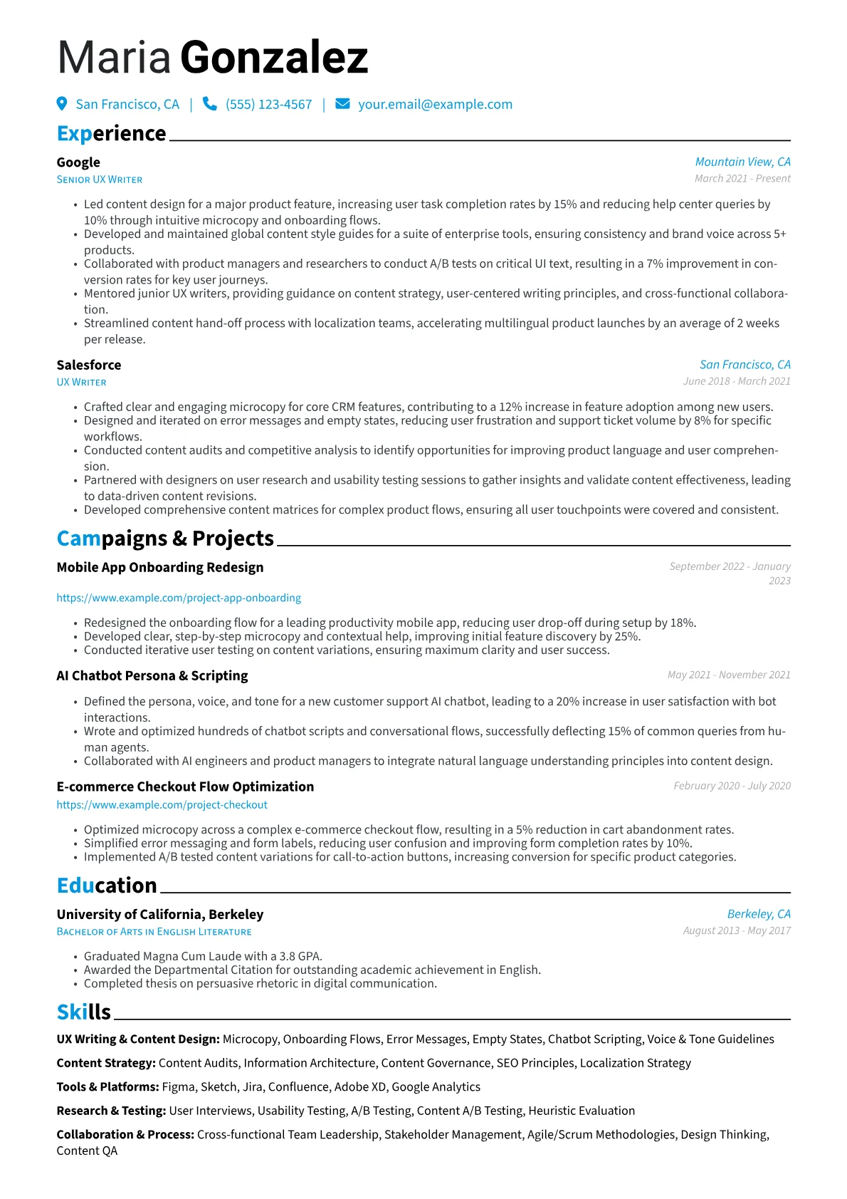 This compelling template was built using JobSprout and can be easily remixed to craft your own standout UX Writer resume.