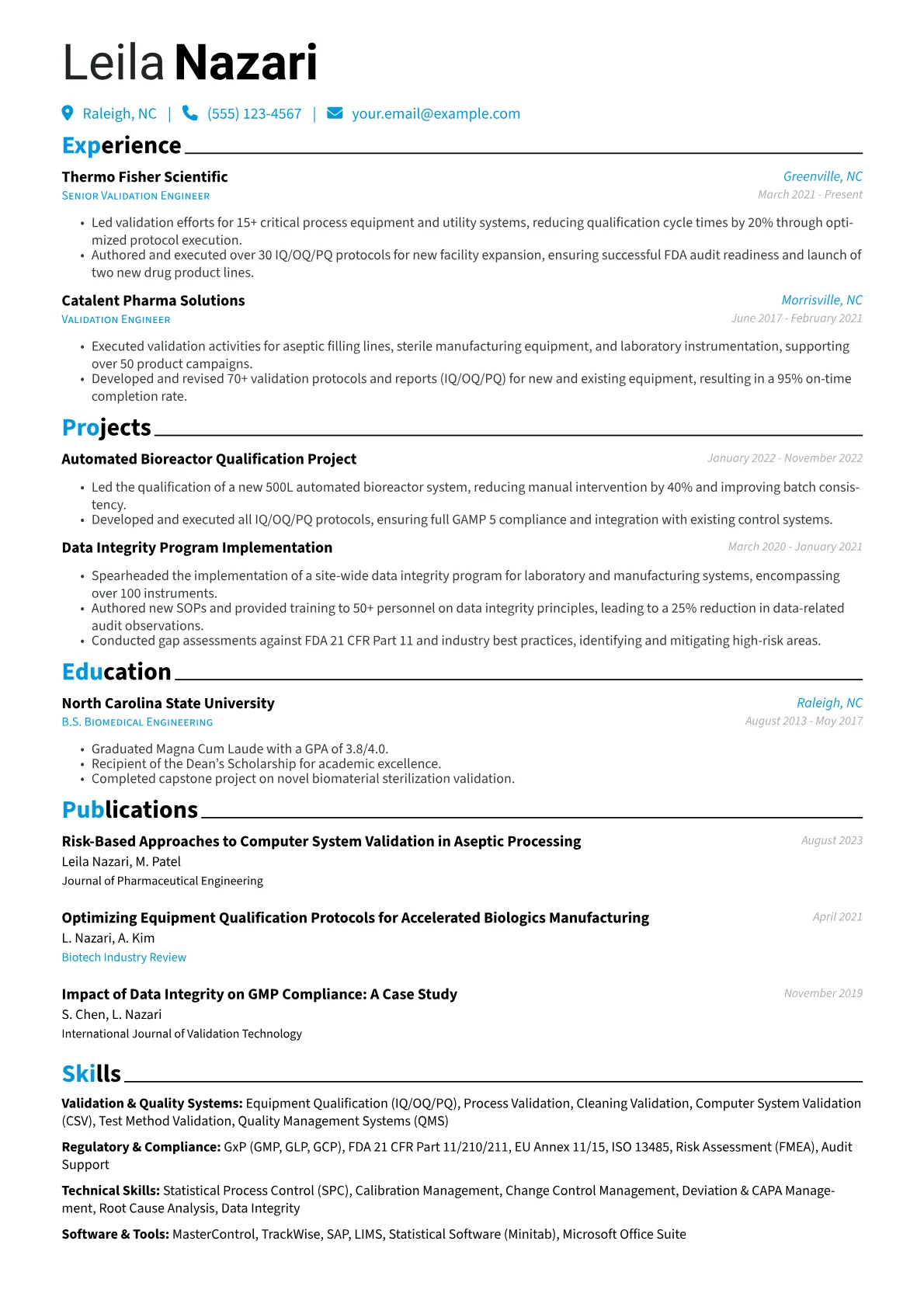 A strong Validation Engineer resume in manufacturing showcases expertise in process qualification, equipment validation, and adherence to industry regulations. Hiring managers prioritize candidates who can demonstrate a commitment to quality systems, risk management, and maintaining operational efficiency within production environments. The unique challenge lies in balancing rigorous compliance with pragmatic, uninterrupted manufacturing processes.