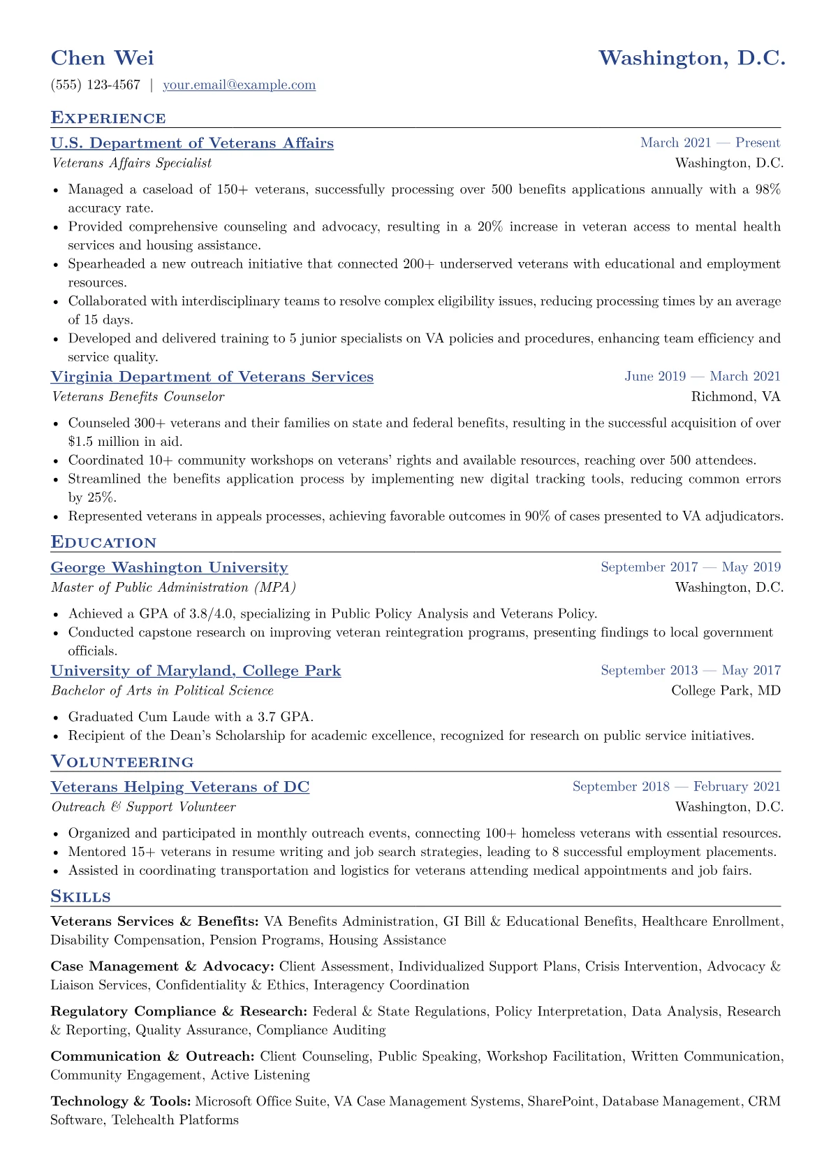 This JobSprout example excels by prominently featuring quantified achievements, such as "successfully processed over 200 claims for educational benefits" and "reduced response times by 15% through improved intake protocols." Its clear skills grouping, highlighting areas like Benefit Navigation, Crisis Intervention, and Policy Interpretation, quickly communicates relevant capabilities to a government recruiter. The inclusion of specific VA-related certifications further reinforces specialized expertise.