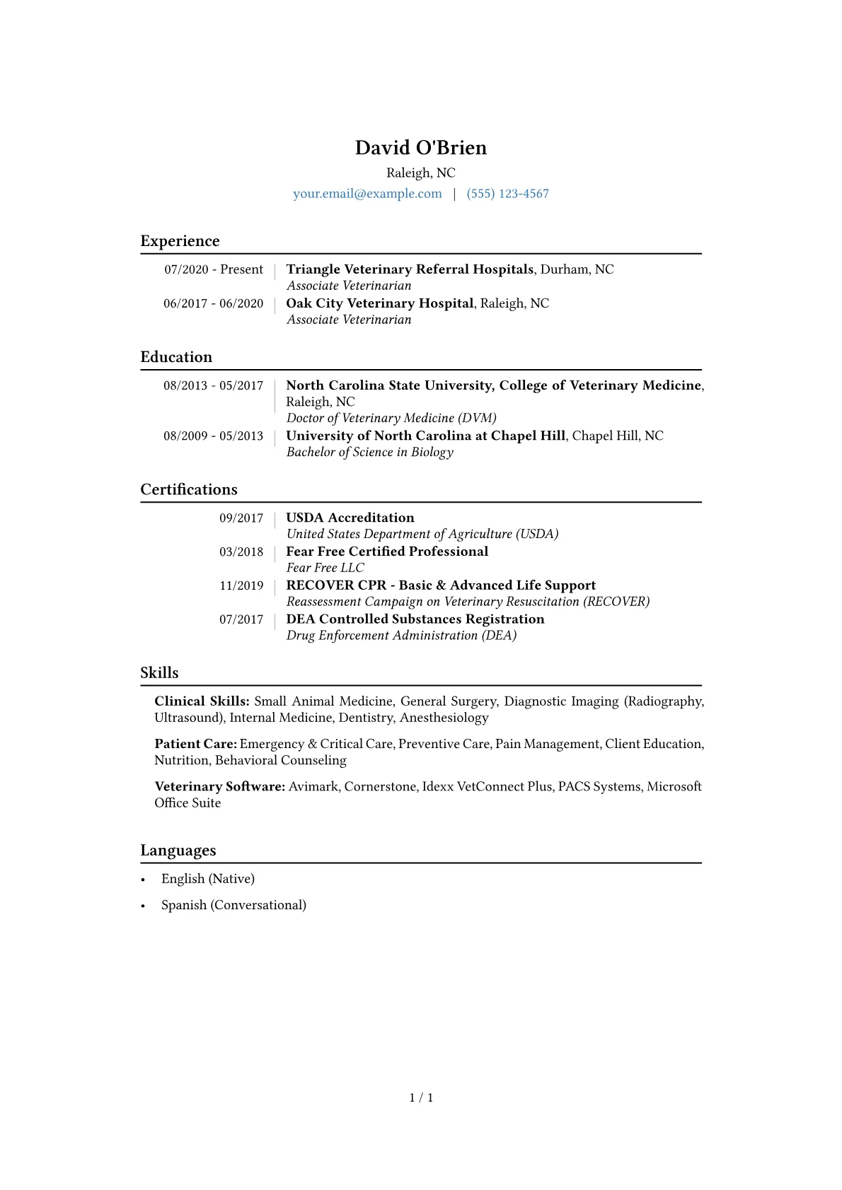 A strong Veterinarian resume clearly highlights clinical expertise, diagnostic proficiency, and exceptional patient care skills, critical for mid-level roles in the demanding healthcare industry. Hiring managers seek demonstrable experience with diverse species, client communication abilities, and a proven track record in both routine and emergency procedures. The unique challenges of high caseloads and sensitive client interactions make a focused, impactful resume essential.
