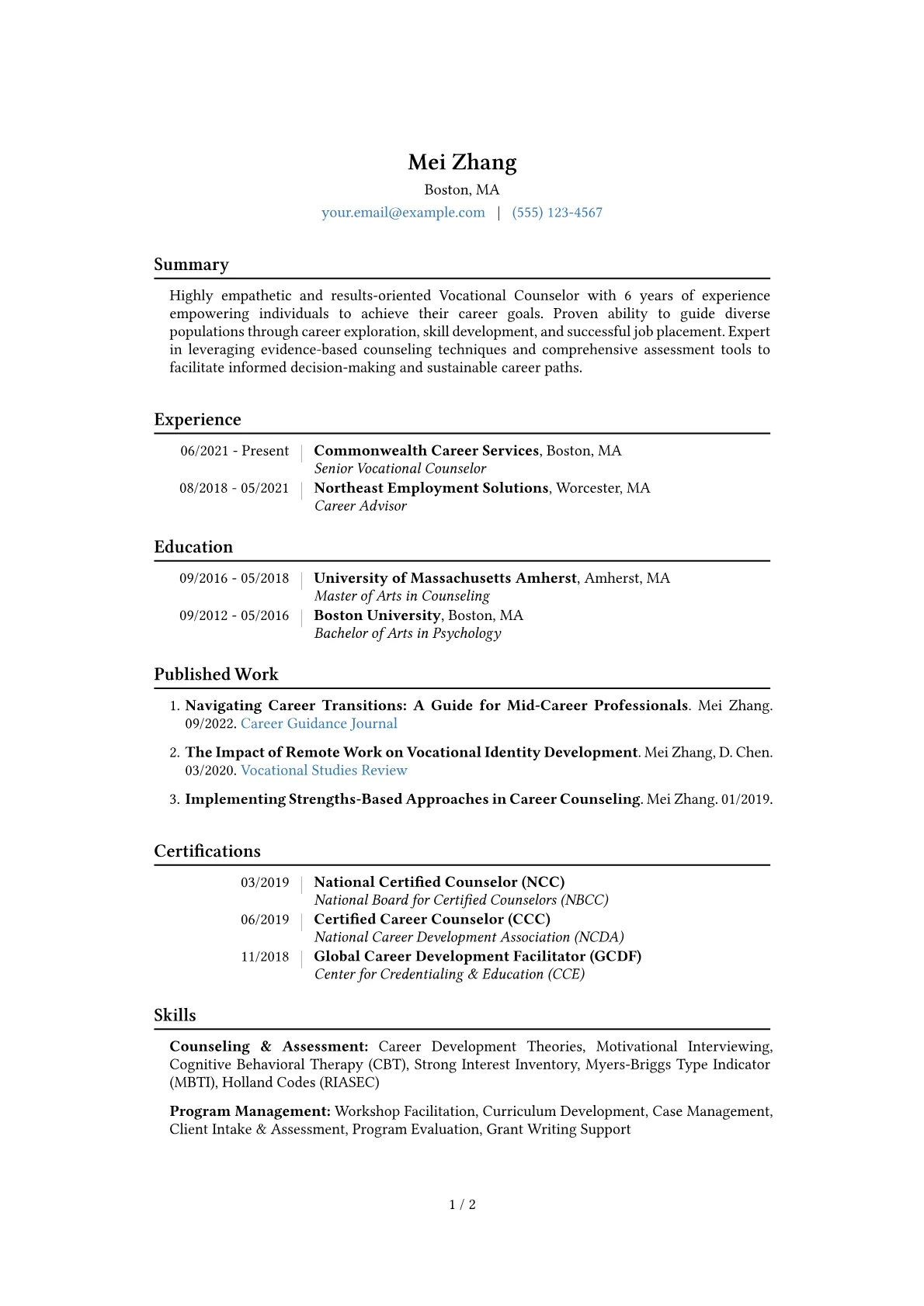 This example CV excels by clearly quantifying achievements, such as "Increased student engagement in career exploration workshops by 30%." Skills are effectively grouped into relevant categories like "Career Development & Assessment" and "Program Design & Implementation," making key competencies immediately visible. Crucially for a Vocational Counselor, specific certifications like the NCC are prominently displayed, alongside relevant assessment tools and educational software proficiency. The structure effectively highlights the candidate’s ability to bridge academic goals with future career success, a critical expectation in the education sector.