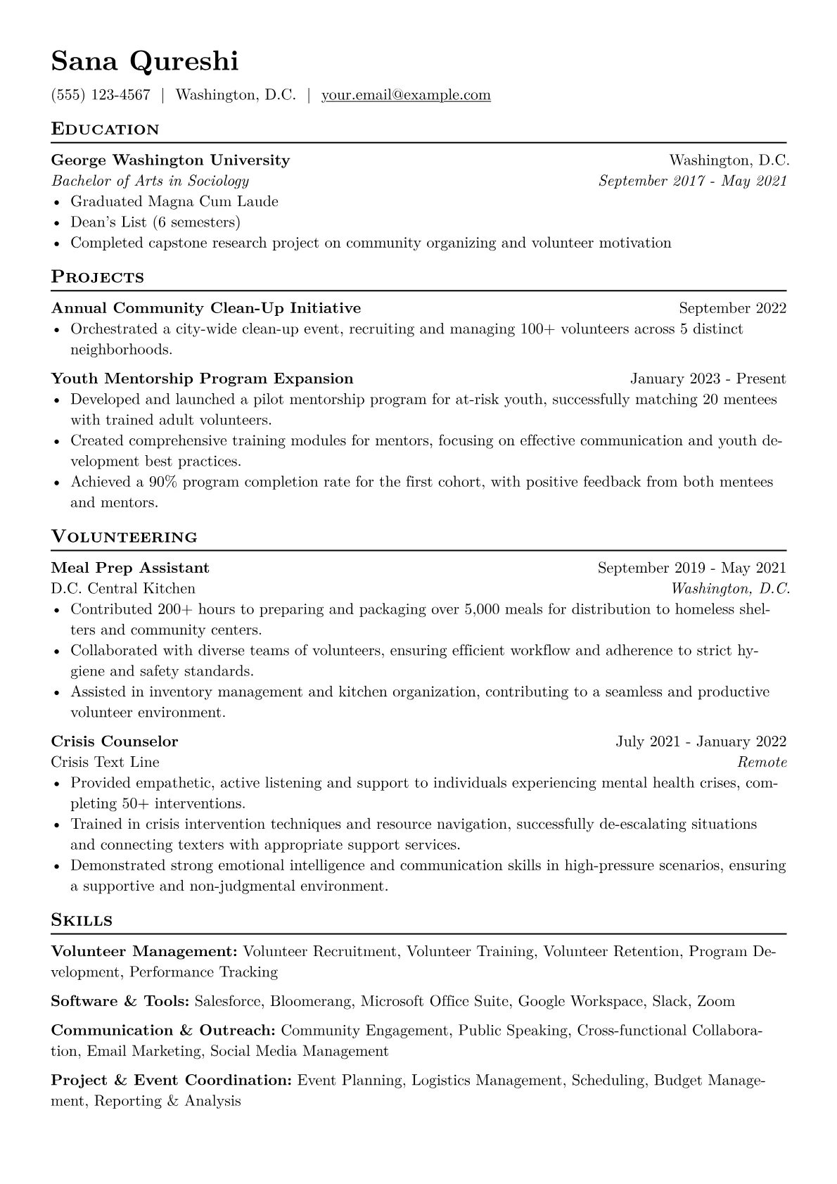 This example excels by using a clear skills section that groups relevant abilities like "Volunteer Recruitment," "Event Logistics," and "Data Management," making key competencies immediately visible. It also smartly incorporates quantified achievements, even from limited experience, showcasing tangible contributions and a results-oriented approach.