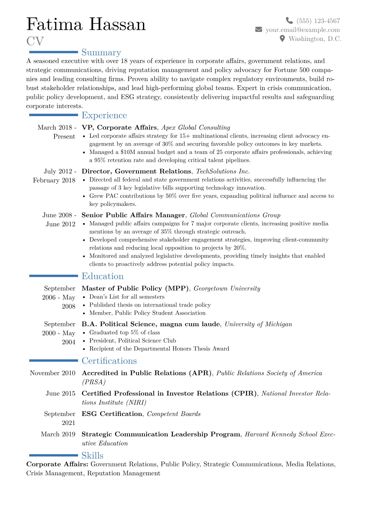 This versatile template was built using JobSprout and can be easily customized to craft your own compelling VP of Corporate Affairs resume. Tailor its structure and content to reflect your unique achievements and career trajectory.