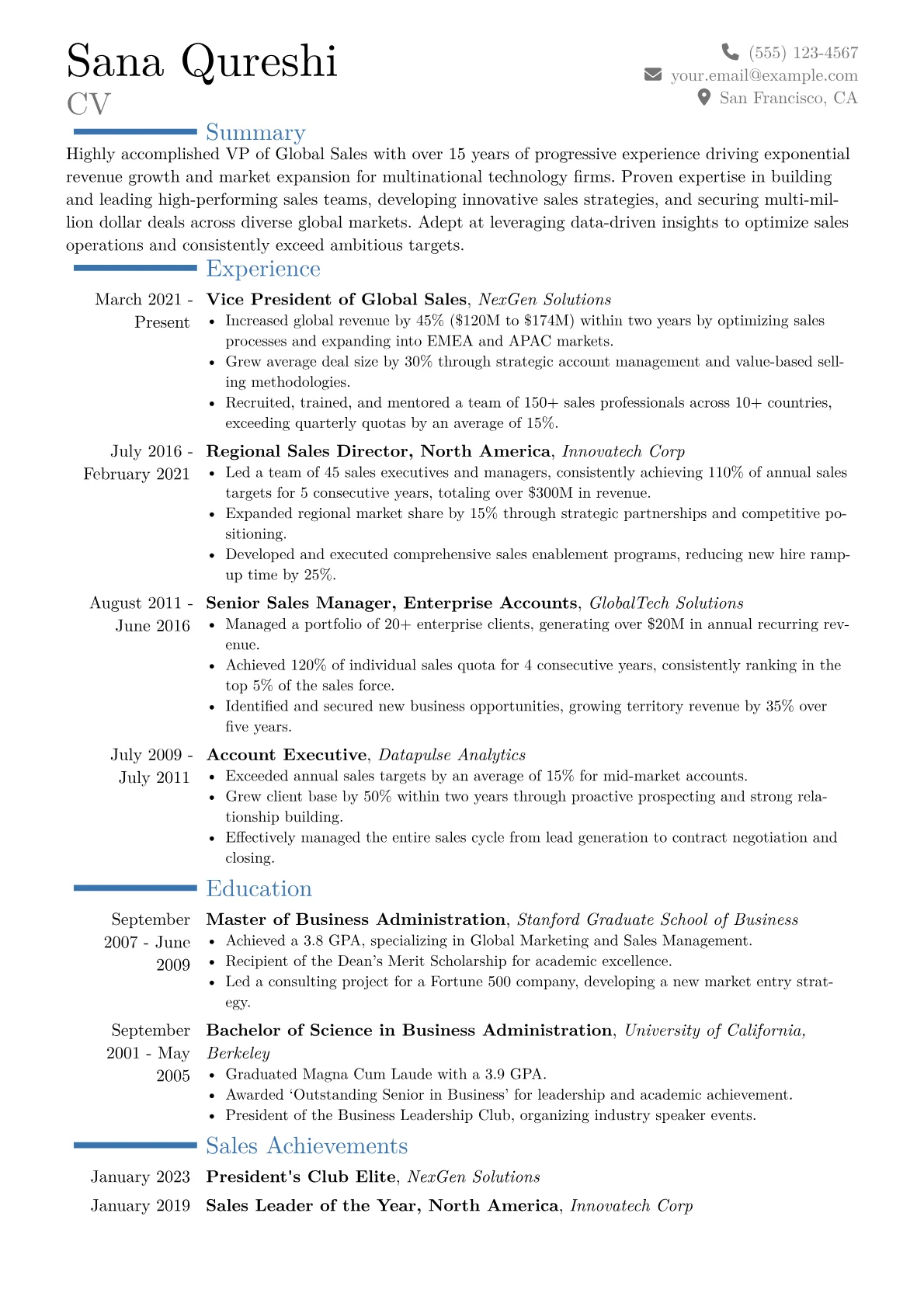 The JobSprout example effectively highlights critical executive-level accomplishments. Its structure immediately presents quantified successes, such as "increased global ARR by 40% across 20+ countries" or "penetrated three new emerging markets, securing $50M in new revenue." Skills are strategically grouped under headings like "International Market Penetration," "Enterprise Sales Leadership," and "Strategic Alliance Management," clearly defining the scope of a global sales VP. Proficiency with critical tools like Salesforce CRM, Power BI, and specific sales methodologies like Challenger Sale are prominently featured, underscoring operational and strategic capabilities.