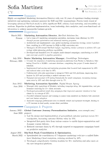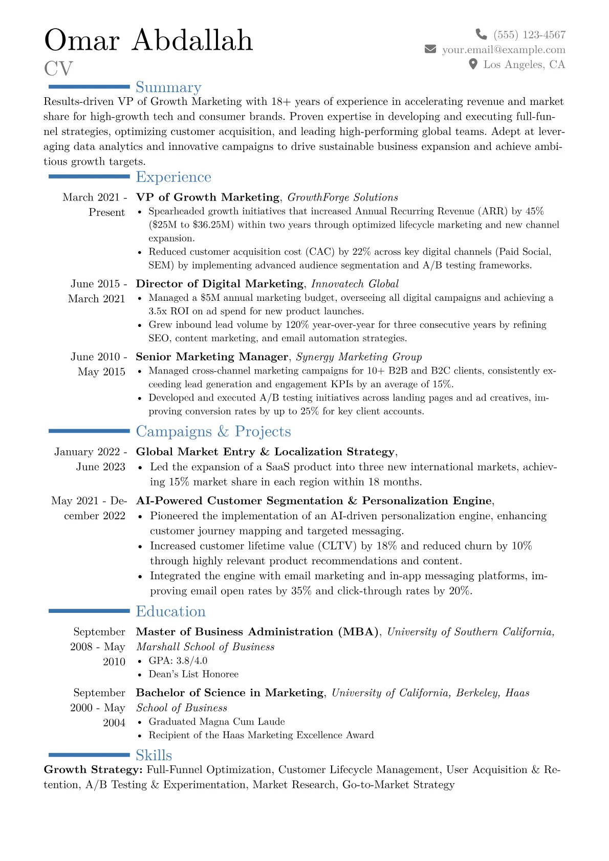 The JobSprout resume example excels by systematically quantifying every achievement, presenting impacts like "increased qualified leads by 40% within 12 months" or "delivered 25% year-over-year revenue growth through performance marketing initiatives." Skills are intelligently grouped to distinguish between strategic oversight (e.g., market entry strategy, brand positioning) and technical proficiency (e.g., Google Analytics 4, HubSpot, programmatic advertising platforms). Highlighting direct experience with relevant tools and certifications, rather than merely listing them, ensures a clear demonstration of capability vital for a senior growth leader.