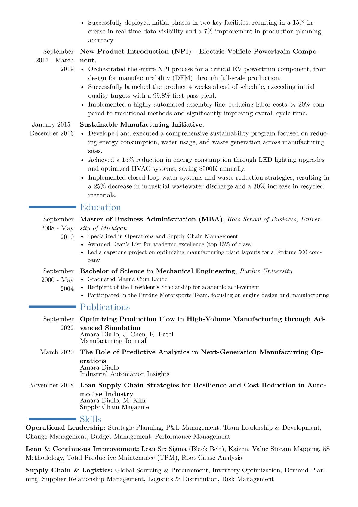 A compelling VP of Manufacturing resume must demonstrate strategic oversight of complex production environments. Hiring managers seek evidence of driving operational excellence, significantly improving OEE, and championing process optimization initiatives like Lean Six Sigma. Key achievements should quantify impact: reducing scrap rates by a specific percentage, increasing throughput, or spearheading successful factory automation projects. Showcase experience managing multi-site operations, navigating global supply chains, and fostering a culture of continuous improvement and safety. Specific terminology like MES, ERP, Kaizen, and certifications such as a Six Sigma Black Belt are essential for showcasing relevant expertise.