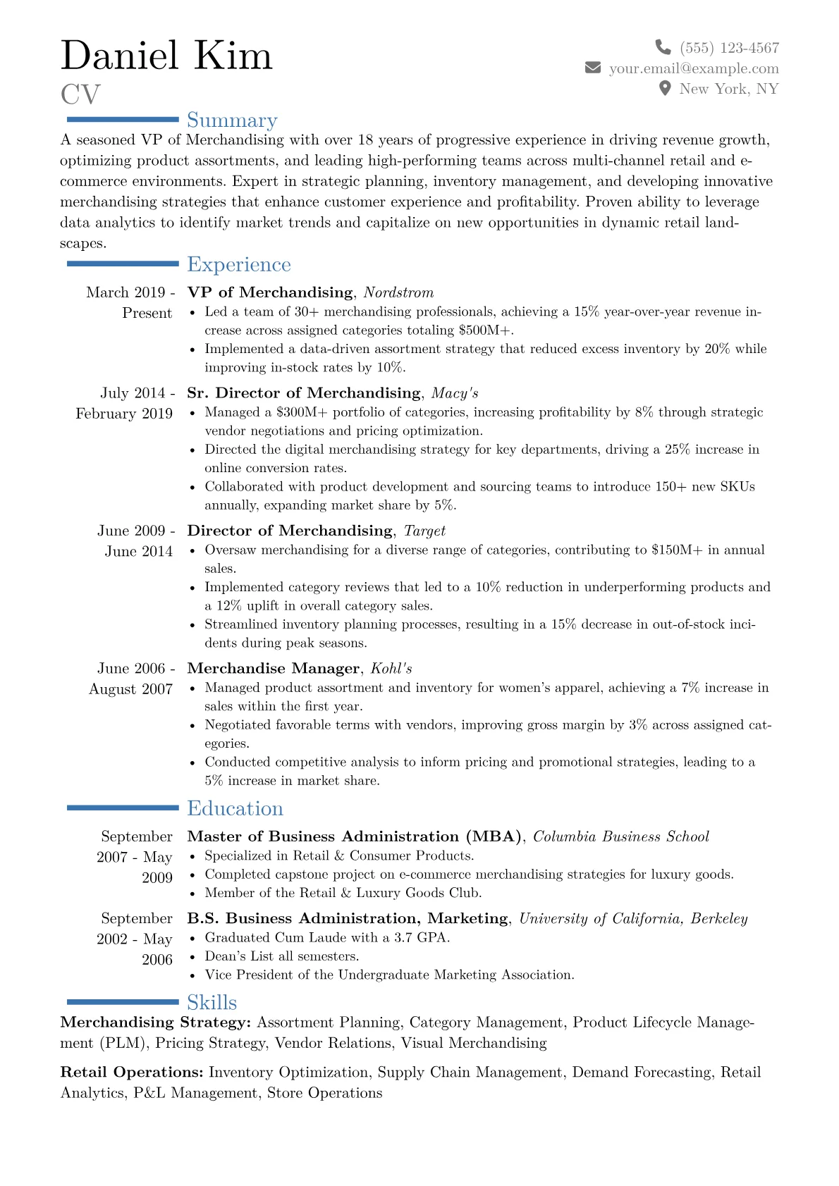 This example resume excels at demonstrating executive-level proficiency. Achievements are quantified effectively, showing exact percentage increases in market share for new product launches or reductions in lead times. Skills are logically grouped, perhaps under headings such as "Omnichannel Merchandising Strategy" and "Global Sourcing & Vendor Negotiations," directly addressing critical areas for the role. Crucial tools, whether advanced analytics platforms or specific ERP systems like SAP Retail, are prominently highlighted, showcasing a command of industry technology.