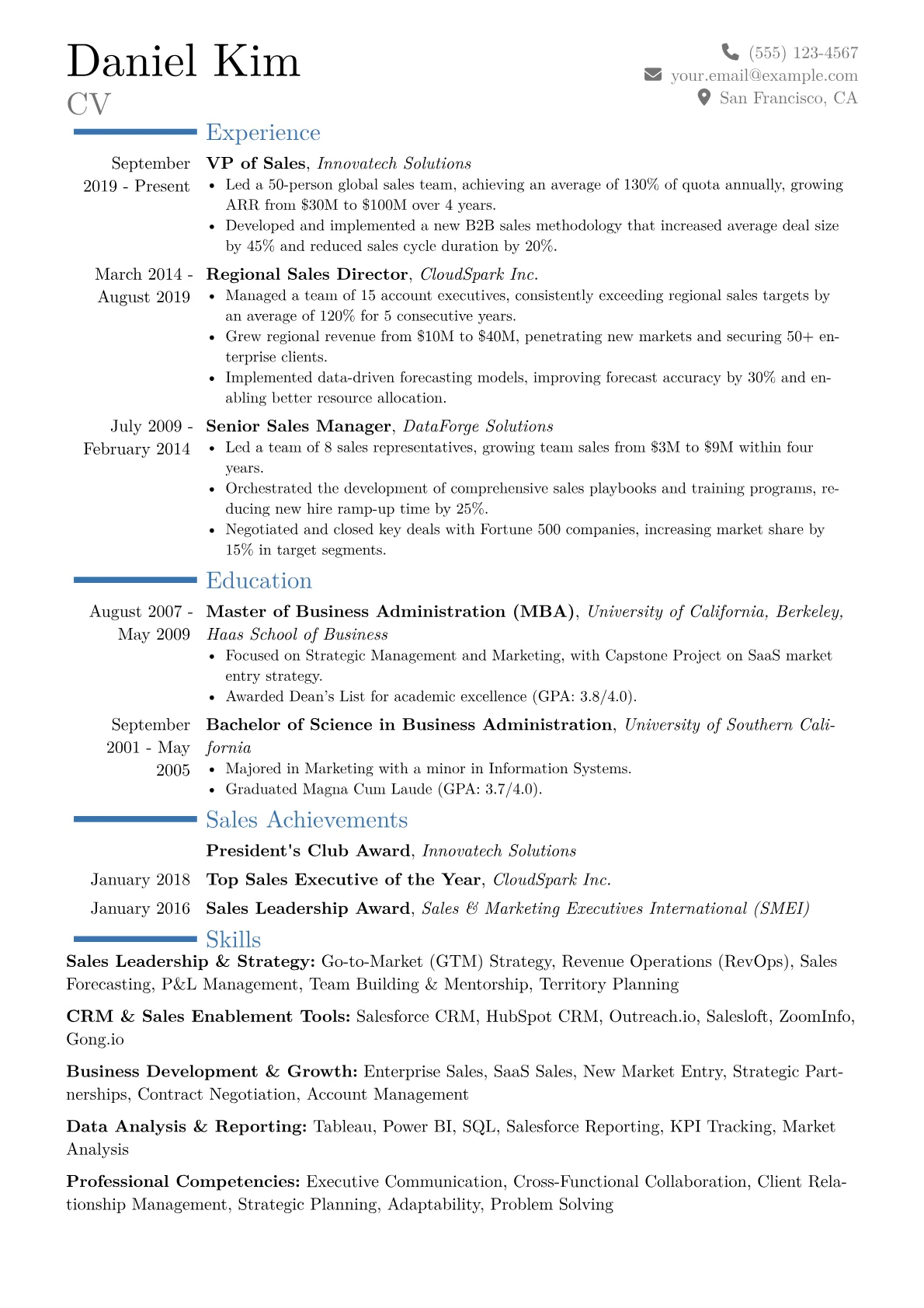 This JobSprout example effectively highlights critical executive-level achievements through its use of prominent, quantified results, such as percentage increases in revenue or successful market entry. It strategically groups key skills like "SaaS Sales Leadership" and "Global Market Expansion," immediately communicating expertise relevant to modern tech sales. The clean layout ensures hiring managers can quickly grasp the candidate's strategic contributions and leadership prowess.