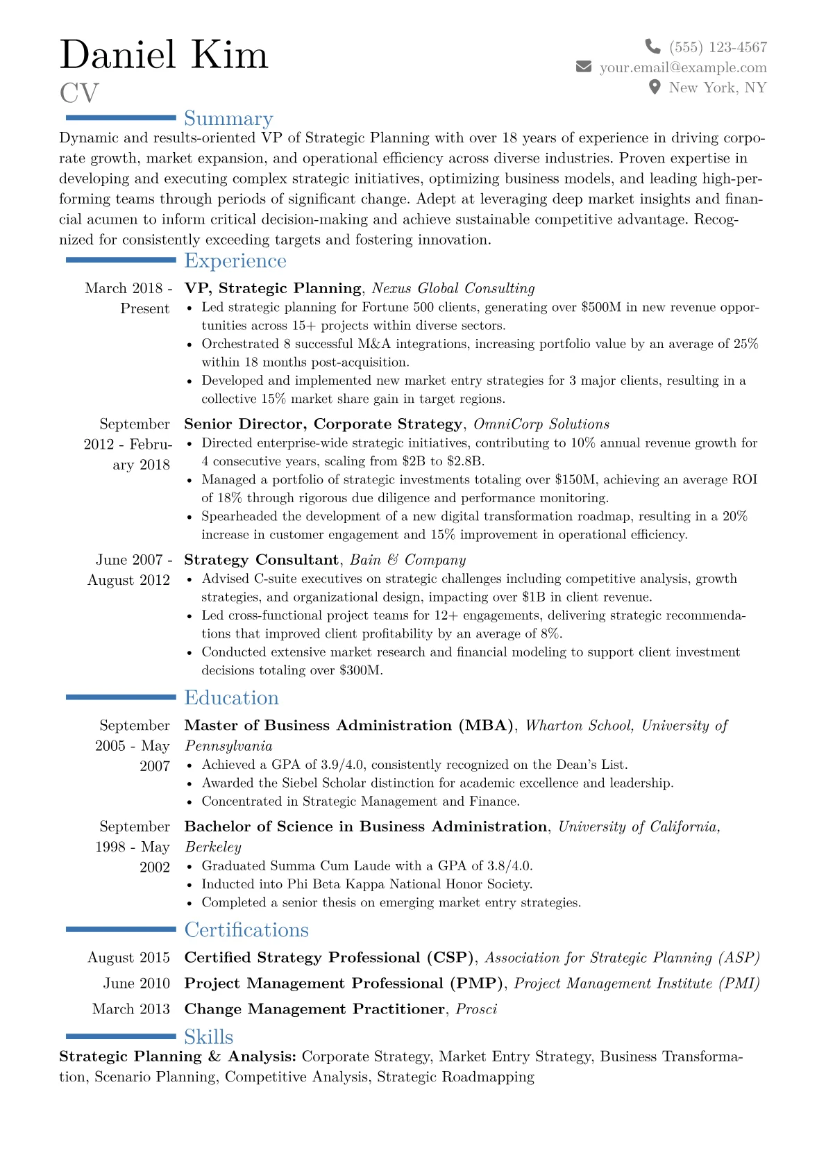 A compelling resume for a VP of Strategic Planning in Consulting must immediately showcase impactful, quantified results in driving large-scale operational and strategic change. Hiring managers in this highly competitive sector look for clear evidence of leading complex client engagements, translating strategic vision into tangible P&L improvements, and spearheading initiatives like post-merger integration or market entry that deliver significant ROI. Concrete examples might include "orchestrated a global supply chain optimization reducing logistics costs by 15% across five regions" or "developed a digital transformation roadmap increasing client’s recurring revenue by 22%." Certifications such as Lean Six Sigma Master Black Belt or expertise in enterprise architecture frameworks like TOGAF are also key differentiators.