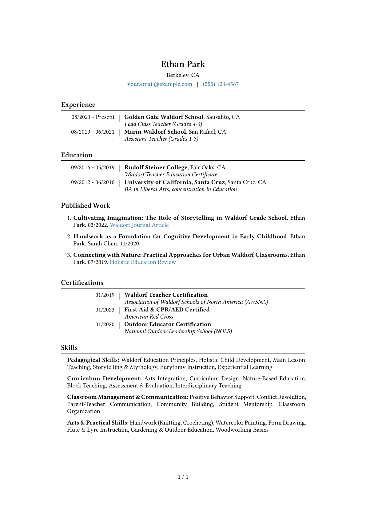 This example excels by showcasing quantified achievements, illustrating tangible impacts on student growth and classroom environment through specific projects and initiatives. Its well-structured skills grouping highlights both pedagogical expertise and specialized artistic proficiencies essential to Waldorf education. Relevant certifications are also prominently featured, affirming professional training in this unique educational philosophy.