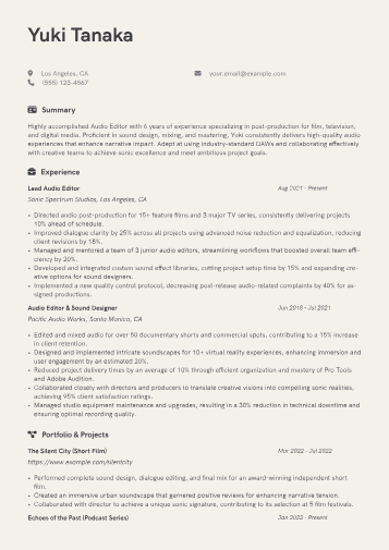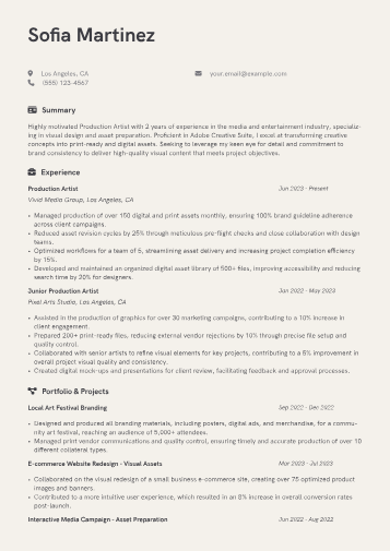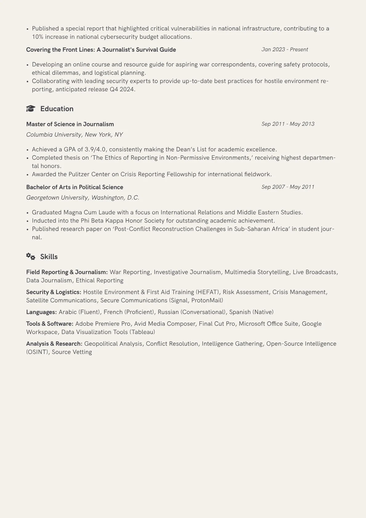 The JobSprout War Correspondent example effectively demonstrates these requirements. It quantifies achievements by detailing "15+ daily dispatches from three active conflict zones" and "securing exclusive interviews leading to a 20% audience engagement increase." Skills are precisely grouped, highlighting "Field Operations & Safety (HEAT certified, tactical medicine)" alongside "Multimedia Production (4K videography, satellite uplink)." Crucially, certifications such as "Hostile Environment Awareness Training (HEAT)" and "Remote First Aid" are prominently featured, as are specific tools like "Secure Satellite Communication Systems (Thuraya, Inmarsat)."