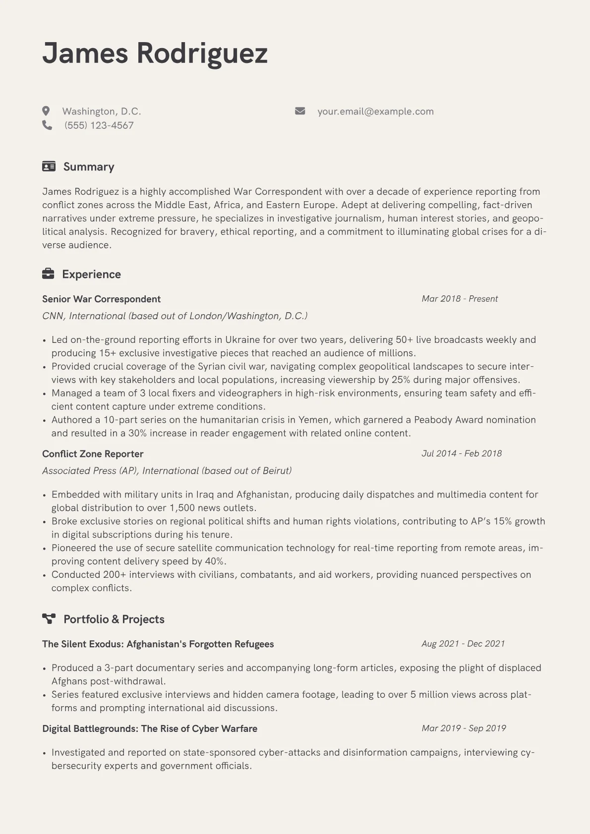 This template was built with JobSprout and can be remixed to create your own tailored War Correspondent resume.