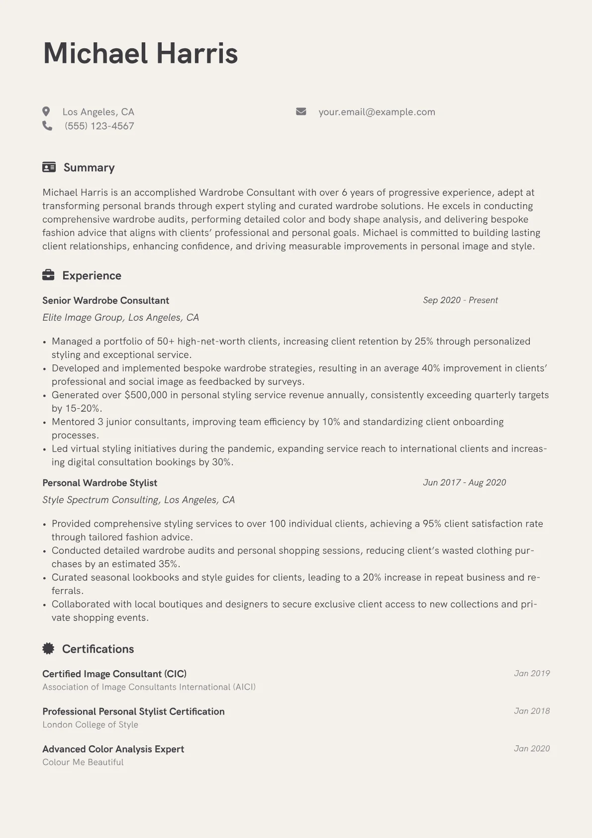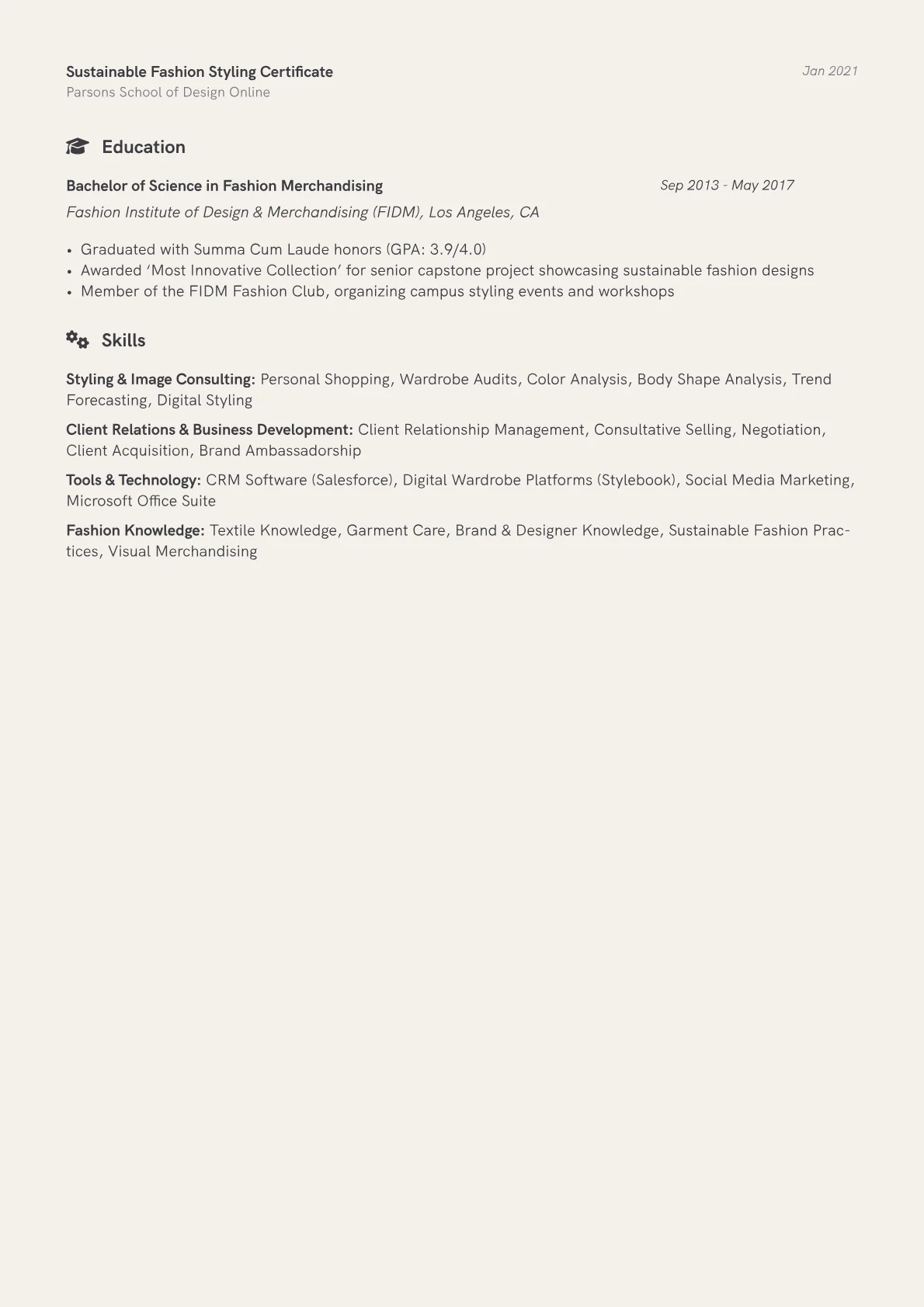 This template was built with JobSprout and can be remixed to create your own tailored Wardrobe Consultant resume. Craft a standout application reflecting your unique skills and achievements effortlessly.