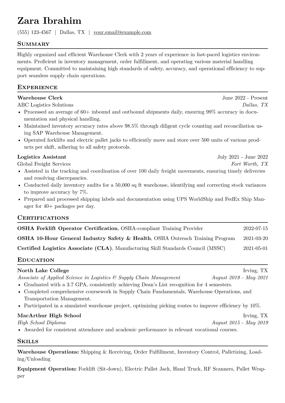 This template was built with JobSprout and can be remixed to create your own tailored Warehouse Clerk resume, showcasing your specific abilities and accomplishments.