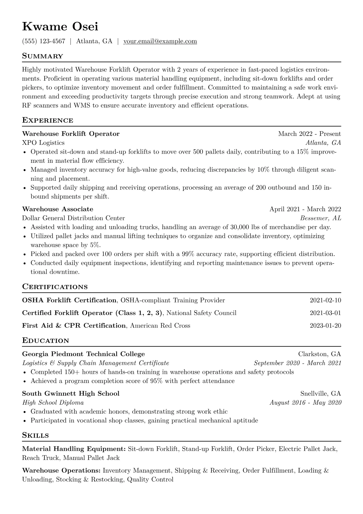 This template was built with JobSprout and can be remixed to create your own tailored Warehouse Forklift Operator resume. Utilize its structure to showcase your unique skills and experience.