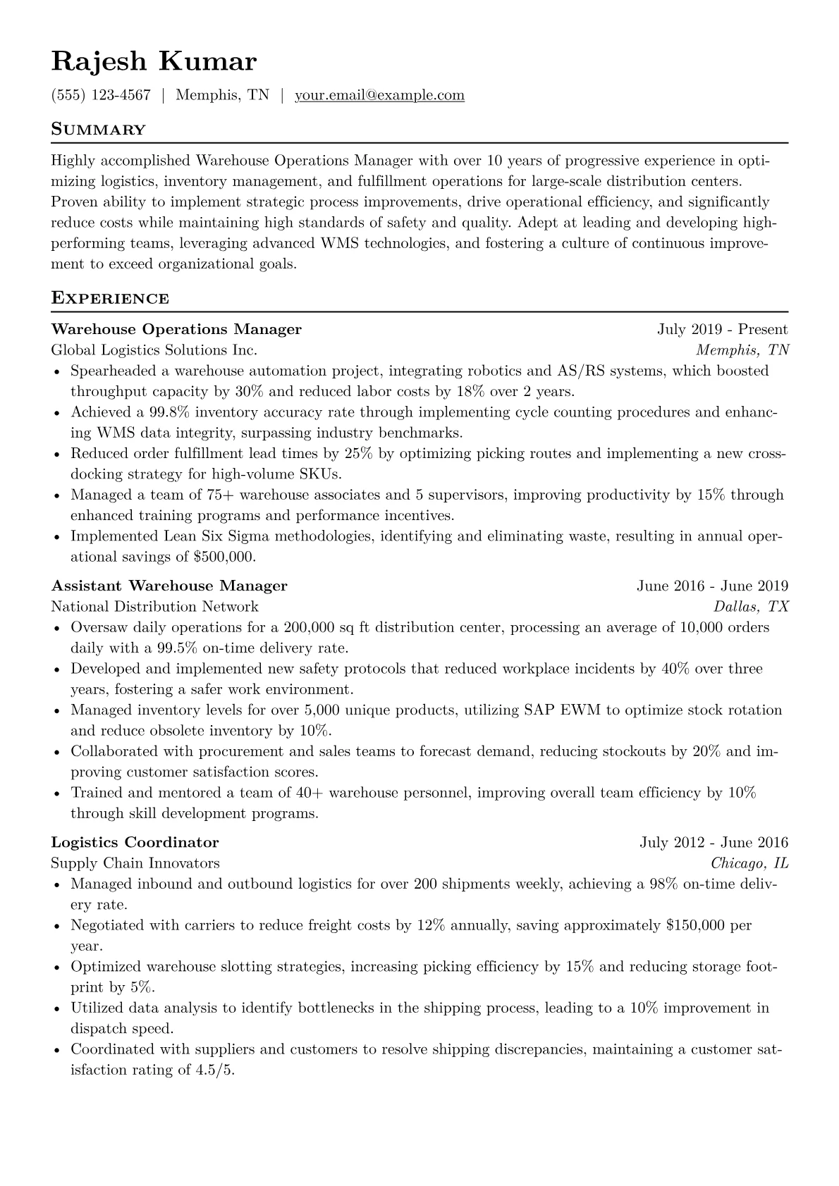 This template was built with JobSprout and can be remixed to create your own tailored Warehouse Operations Manager resume. Leverage its structure to present your achievements compellingly.
