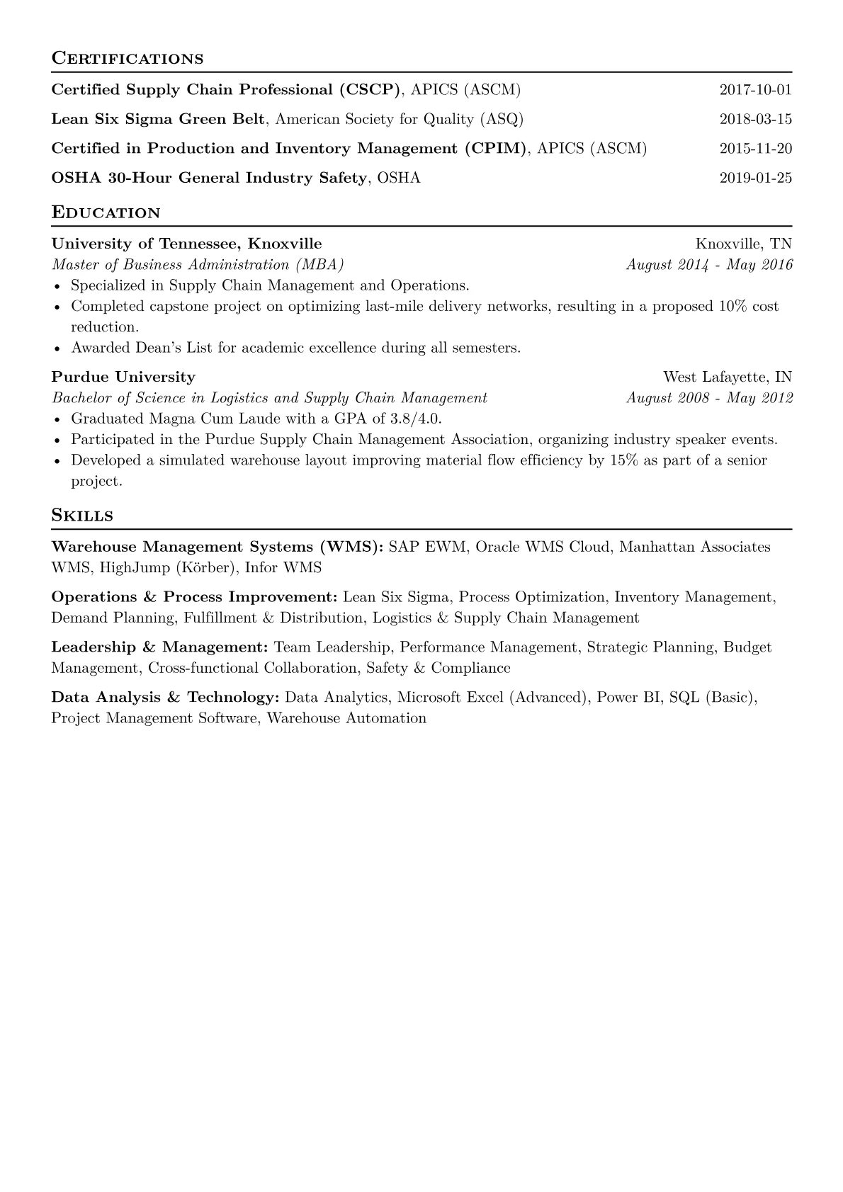 The JobSprout example excels at highlighting these crucial aspects. Its achievement bullet points are robustly quantified, detailing specific percentage improvements in operational metrics or cost savings rather than merely listing responsibilities. Skills are intelligently grouped, emphasizing core competencies like "Inventory Management," "Logistics Optimization," and "Safety Compliance" alongside "Team Leadership." The template prominently features experience with key WMS platforms and highlights leadership roles involving large teams, which are vital for a senior operations manager.