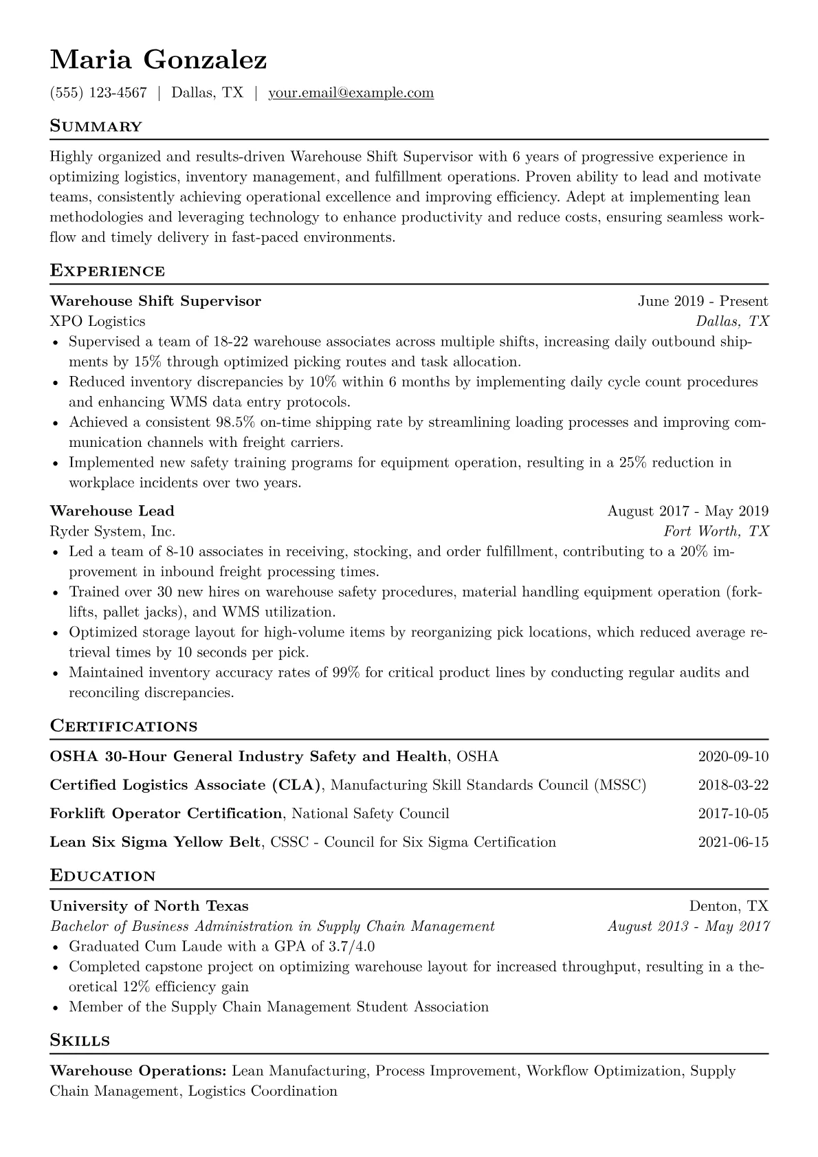 This example CV effectively showcases these priorities through its structure and content. Achievements are precisely quantified, for instance, by detailing reduced loading errors by 15% or improving order fulfillment speed by 10%. Skills are clearly grouped into categories such as Technical Proficiency, Operations Management, and Team Leadership, making it easy for recruiters to identify relevant expertise. Crucial certifications like OSHA 30 and specific WMS tools, such as SAP or Oracle WMS, are prominently highlighted, underscoring the candidate's practical capabilities.