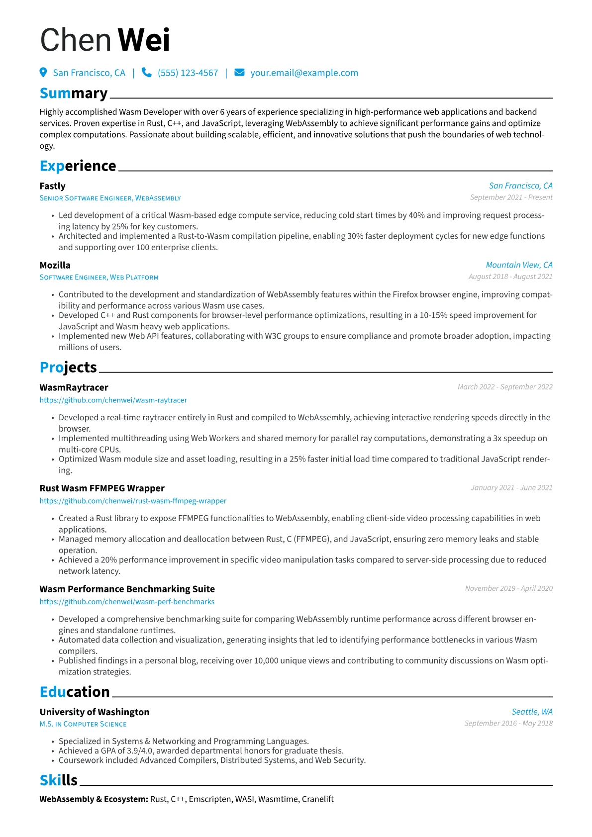 This example CV on JobSprout effectively highlights a Wasm Developer's unique capabilities. It groups technical skills precisely, separating "Wasm Runtimes" (e.g., Wasmtime, Wasmer) from "Core Wasm Languages" and "Tooling." Achievements are consistently quantified, demonstrating tangible impact such as "reduced module load time by 35% across critical microservices" or "developed Wasm plugins processing 2M requests per second." The resume prominently features specific project contributions related to Wasm's security sandboxing or cross-platform portability benefits, making the candidate's expertise immediately apparent.