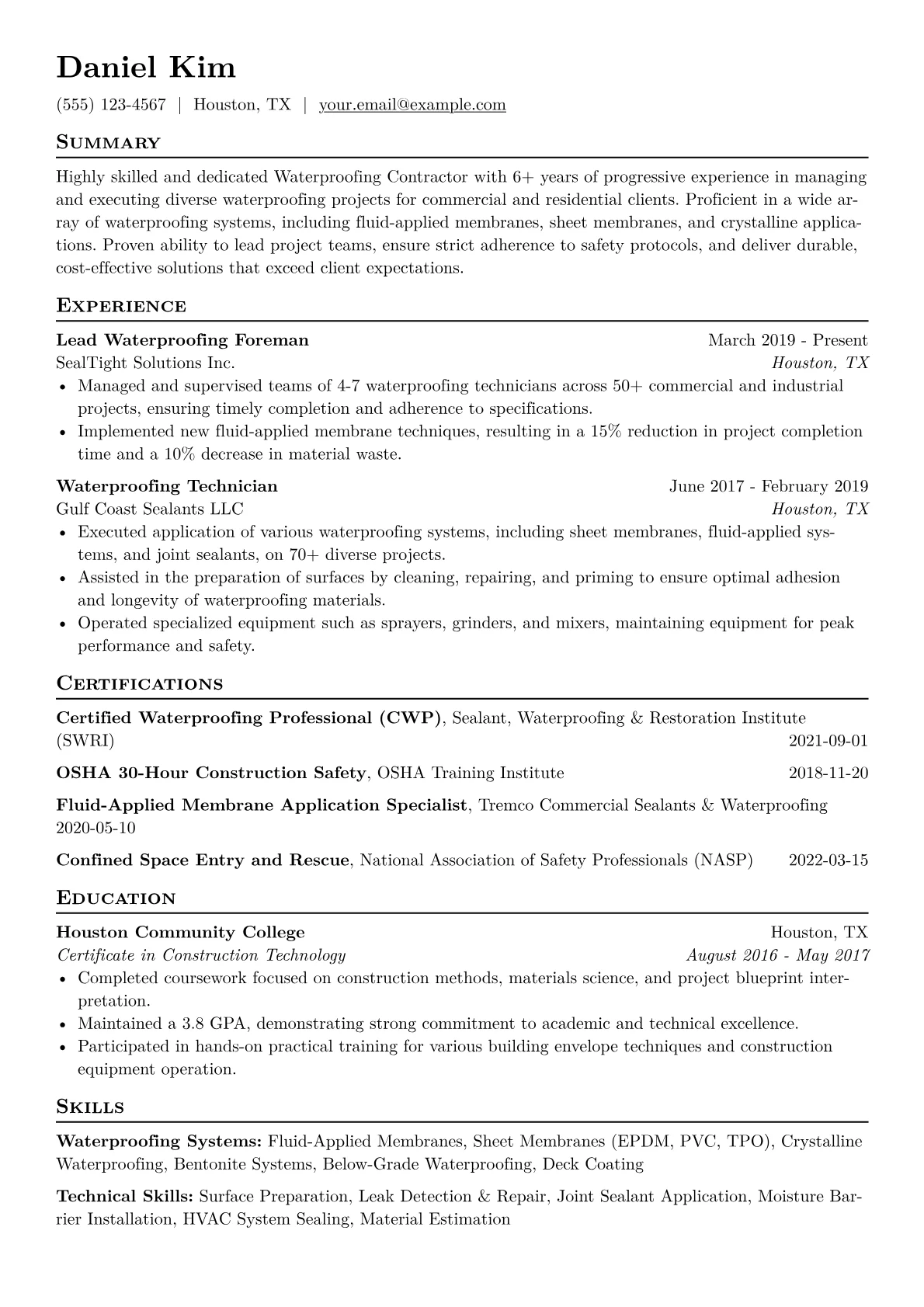This example CV excels by structuring its content to immediately highlight relevant contractor experience. It quantifies achievements effectively, such as "managed waterproofing projects valued up to $150,000" or "reduced moisture-related equipment failures by 20%." Skills are clearly grouped into categories like "Application Techniques" (e.g., spray application, hot air welding), "Material Expertise" (e.g., urethane, polyurea, bentonite systems), and "Safety & Compliance." Crucially, specific certifications like "SSPC C-1 Surface Preparation" and "Confined Space Entry" are prominently featured, alongside familiarity with industrial tools and diagnostic equipment.