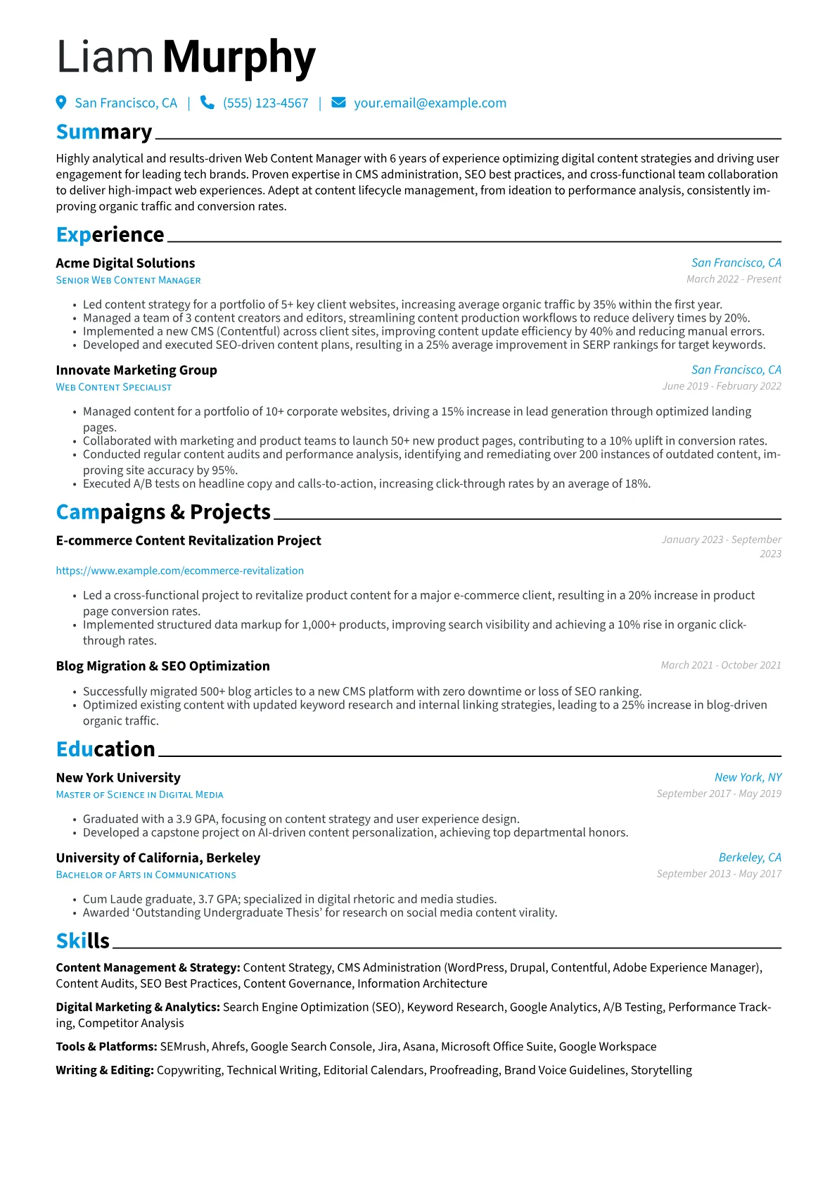 This template was built with JobSprout and can be remixed to create your own tailored Web Content Manager resume.