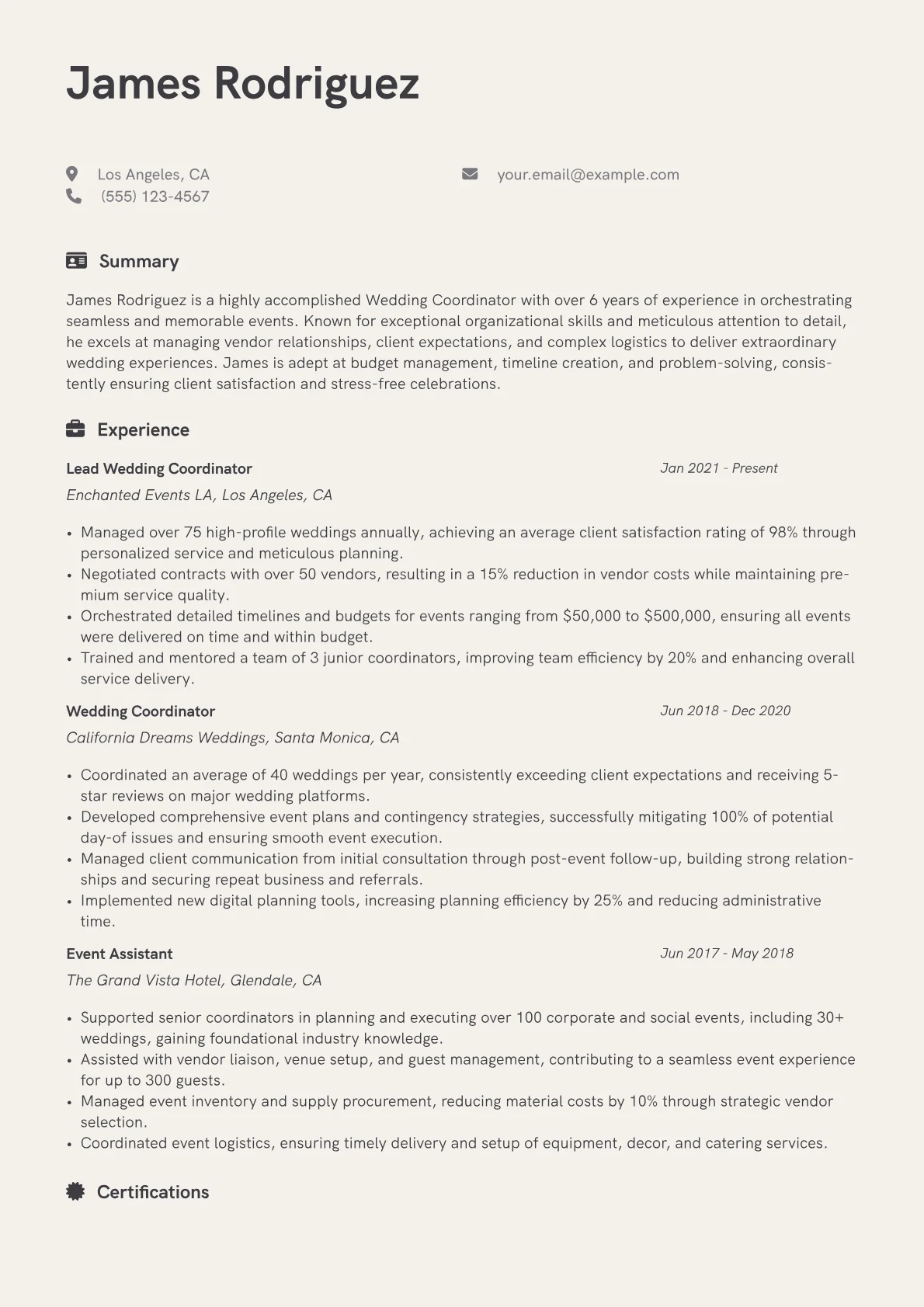 This template was built with JobSprout and can be remixed to create your own tailored Wedding Coordinator resume. Leverage its structure to present your experience with clarity and impact.