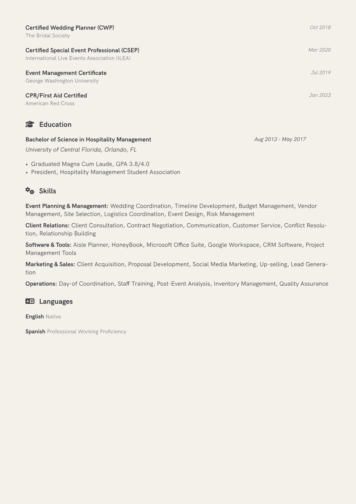 This example CV excels by concretely quantifying accomplishments. It details the number of events managed annually, average client satisfaction scores, and specific cost saving initiatives or timeline adherence rates. Skills are effectively grouped under relevant headings such as "Event Planning & Management," "Client Relations & Communication," and "Vendor & Budget Oversight," making it easy for recruiters to scan for essential competencies. Crucially, the resume highlights industry specific tools and relevant certifications, showcasing a well rounded professional prepared for diverse wedding planning scenarios.