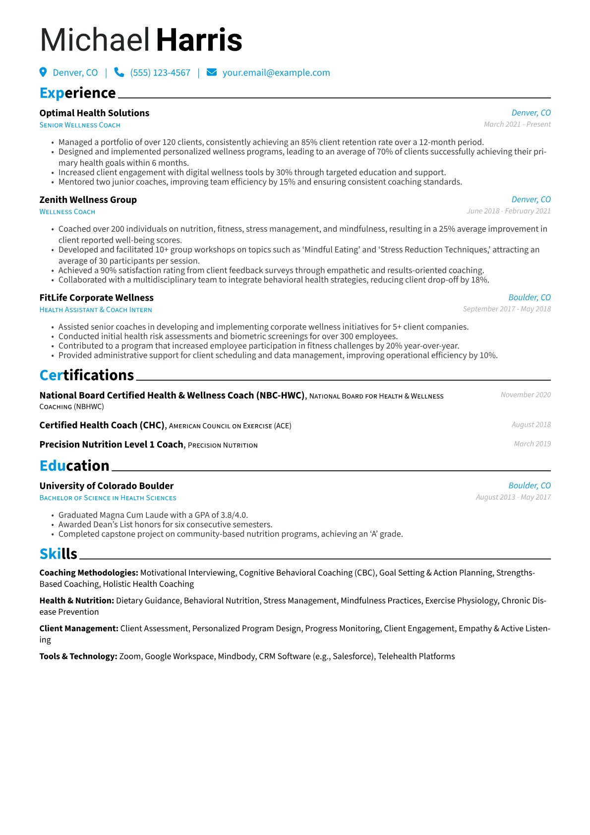 This JobSprout example excels by clearly highlighting quantified achievements, such as specific improvements in client well-being or program participation rates. It intelligently groups relevant certifications like health coaching credentials and nutrition specializations, alongside a robust skills section that balances communication and program management. The resume’s structure makes it easy for recruiters to quickly identify both the coach's qualifications and their demonstrable impact.