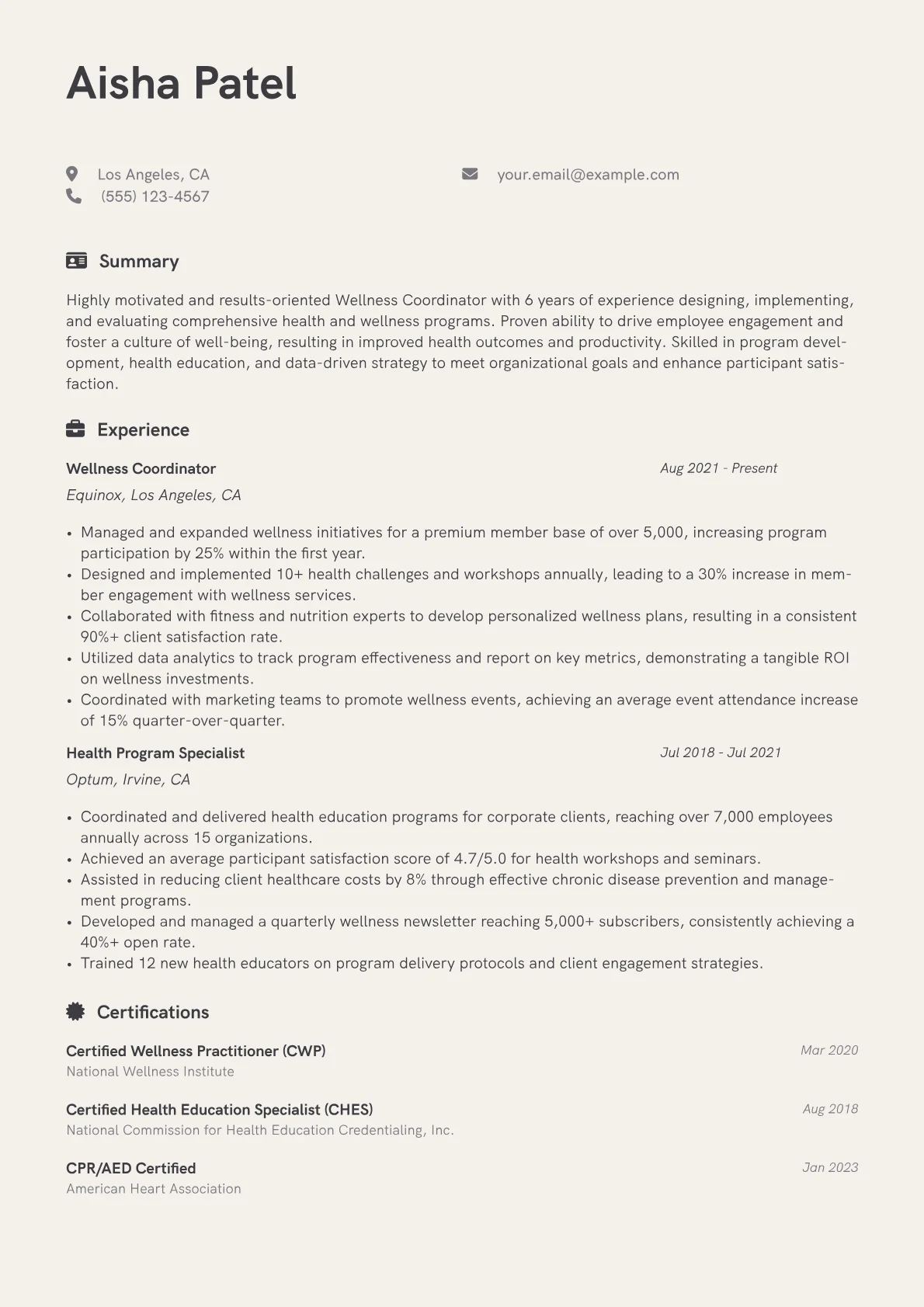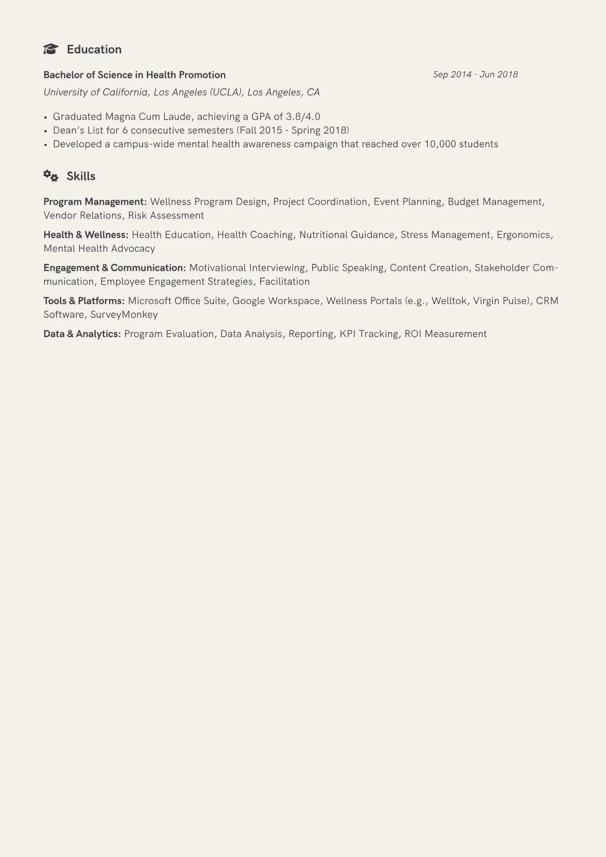 This example resume expertly showcases these critical elements. Achievements are consistently quantified, detailing program growth, such as "increased participation in mindfulness workshops by 30%." Skills are thoughtfully grouped into functional areas like "Wellness Program Development," "Stakeholder Engagement," and "Data-Driven Reporting," clearly aligning with the role's strategic demands. It effectively highlights relevant certifications like CHES under a dedicated section, alongside proficiency in wellness platforms. The resume also includes specific program examples, detailing initiatives from ergonomic assessments to stress reduction challenges, proving practical experience.