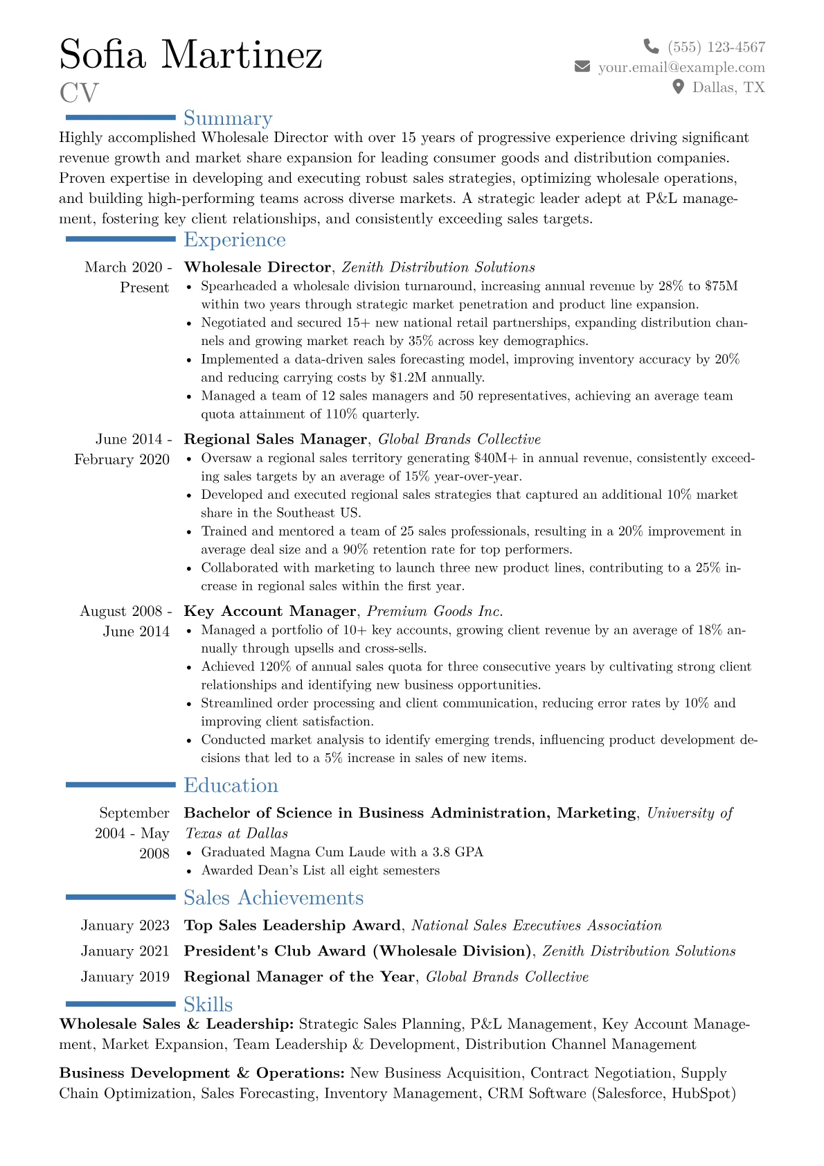 This example CV excels at presenting these executive-level qualifications. It quantifies achievements precisely, for instance, detailing how the candidate "increased annual wholesale revenue by 28%" or "expanded market reach by 15% through new partnerships." Skills are intelligently grouped under headings like "Strategic Sales Leadership," "Channel Development," and "Operational Excellence," clearly communicating a comprehensive skill set. The inclusion of relevant tools and certifications, such as proficiency in Salesforce or SAP S/4HANA, further solidifies the candidate's executive readiness.