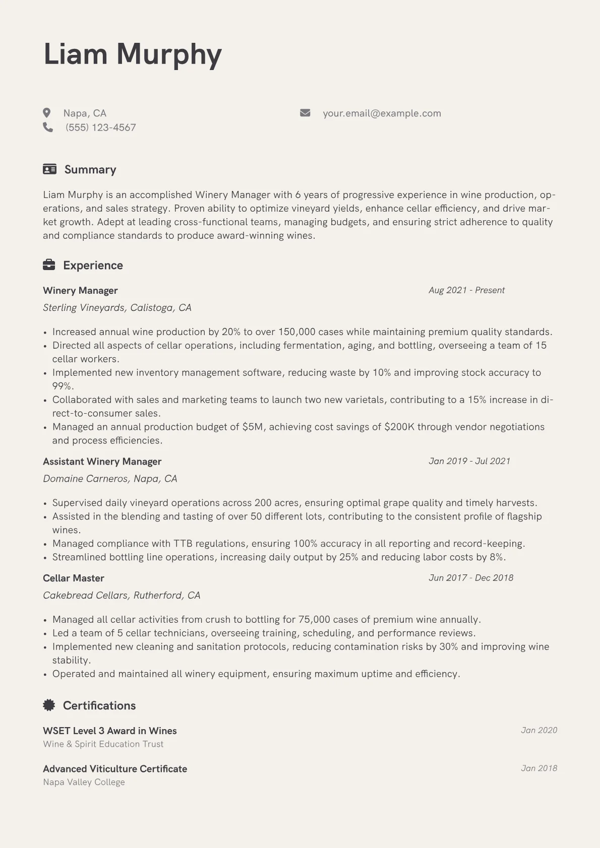 This template was built with JobSprout and can be remixed to create your own tailored Winery Manager resume. Utilize its intelligent framework to highlight your specific achievements and industry knowledge effectively.