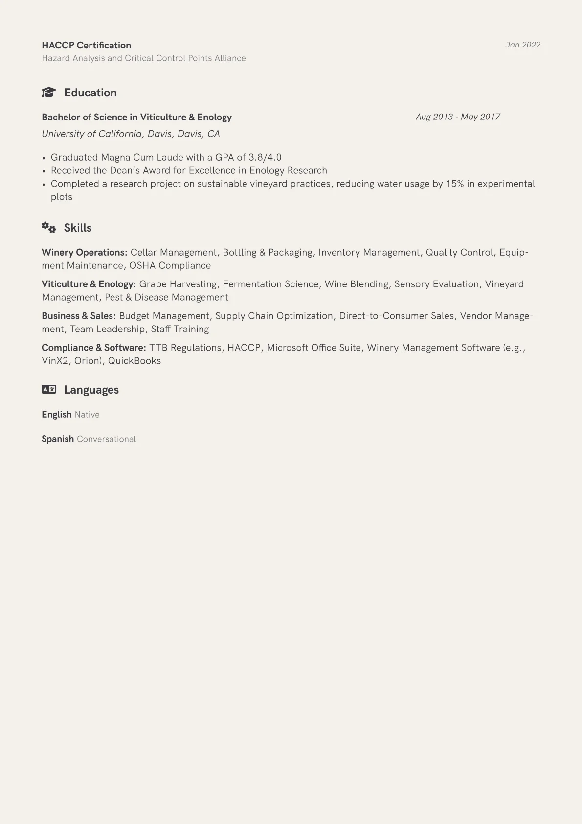 This JobSprout example effectively captures these industry demands. Its structure thoughtfully groups skills into distinct categories such as "Operations & Logistics," "Sales & Hospitality Management," and "Wine Production & Compliance," providing clarity. Achievements are precisely quantified, for example, detailing "increased tasting room revenue by 18% year over year" or "managed inventory for 15,000 cases across diverse vintages." Crucially, specific industry tools like WineDirect and WSET certifications are prominently featured, signaling relevant and immediate value.